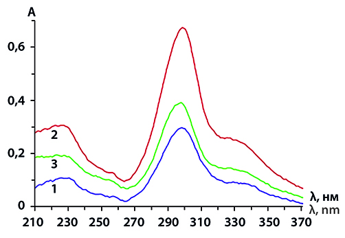 Результаты и обсуждение. При изучении спектров поглощения установлено, что для количественного спектрофотометрического анализа офлоксацина рационально использовать область длин волн 275-320 нм (λmax = 294 нм). Статистическая обработка результатов анализа показала, что относительная погрешность количественного определения не превышает ±1,66 %. Чувствительность определения офлоксацина равна 0,245 мкг/мл при А(min) = 0,02. Разработанная методика валидирована. Подтверждена ее специфичность, линейность, правильность и прецизионность. По градуировочному графику определено содержание офлоксацина в мягкой лекарственной форме, оно находится в пределах 0,0483-0,0562 г, что соответствует допустимым отклонениям.