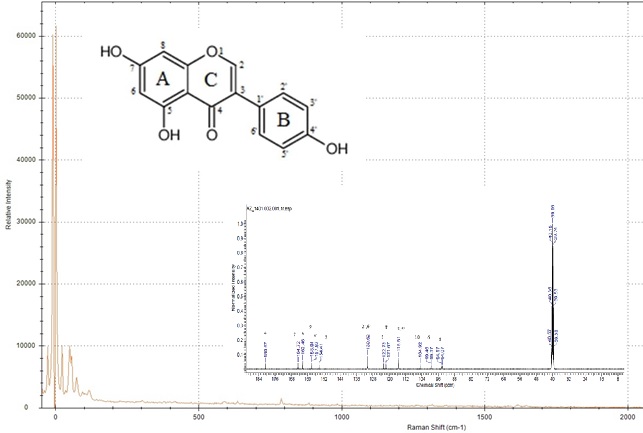 Заключение. Получены спектральные характеристики образцов генистеина, методами ЯМР, ИК и рамановской спектроскопии, которые будут использованы в нормативной документации на СО генистеина, и позволять проводить контроль качества лекарственных средств на его основе и выявлять недоброкачественные БАД.