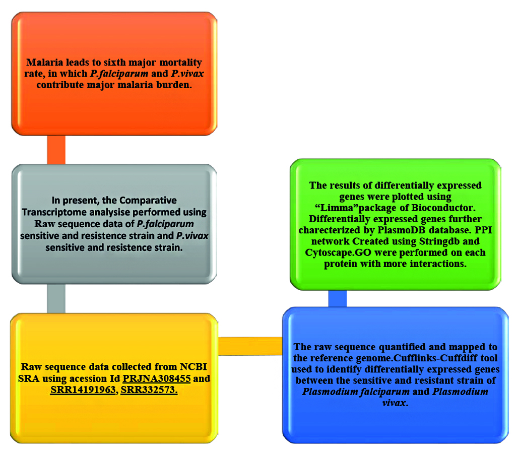 Results and discussion. The sequence of raw RNA was quantified, mapped, and annotated. The total number of reads mapped to the reference genome for Plasmodium falciparum was found to be 45474448 and for Plasmodium vivax was 38226870. The Cufflinks-Cuffdiff tool was used to identify differentially expressed genes in Plasmodium falciparum and Plasmodium vivax sensitive and resistant strains. This differentially expressed gene was further annotated and plotted using the "Limma" package of Bioconductor. The PPI network was constructed in String Database and Cytoscape software. Pathway enrichment analysis of list differentially expressed gene performed using KEGG and GO tool.