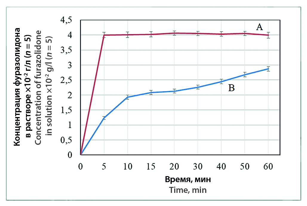 Введение. В лечении инфекционно-воспалительных заболеваний востребованы действующие вещества (ДВ), характеризующиеся низкой резистентностью микроорганизмов, высокой специфичностью механизма действия и широким спектром антимикробной активности. Фуразолидон (ФЗ) – ДВ отвечающее данным критериям, однако тот факт, что он практически нерастворим в воде существенно ограничивает его применение. Повысить растворимость и скорость растворения ДВ с низкой растворимостью в воде позволяет метод твердых дисперсий (ТД). Предшествующие исследования свидетельствуют об увеличении растворимости и скорости растворения ФЗ в воде из ТД с поливинилпирролидоном-24 000 (ПВП-24 000)в соотношении с ДВ > 6 : 1 по массе. Вследствие этого, становится возможным введение ТД ФЗ в состав быстрорастворимых шипучих лекарственных форм, например, гранул для получения растворов для наружного применения для лечения инфекционно-воспалительных заболеваний.