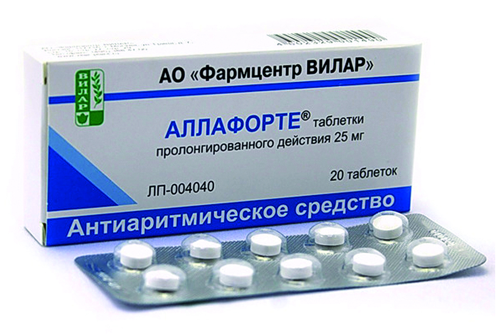 Заключение. Проведено изучение фармакокинетики препарата Аллафорте®, таблетки пролонгированного действия 25 мг (АО «Фармцентр ВИЛАР») при однократном применении с участием здоровых добровольцев. Полученные данные позволяют обеспечить проведение эффективной терапии аритмии исследуемым препаратом, минимизировав вероятность возникновения побочных эффектов.