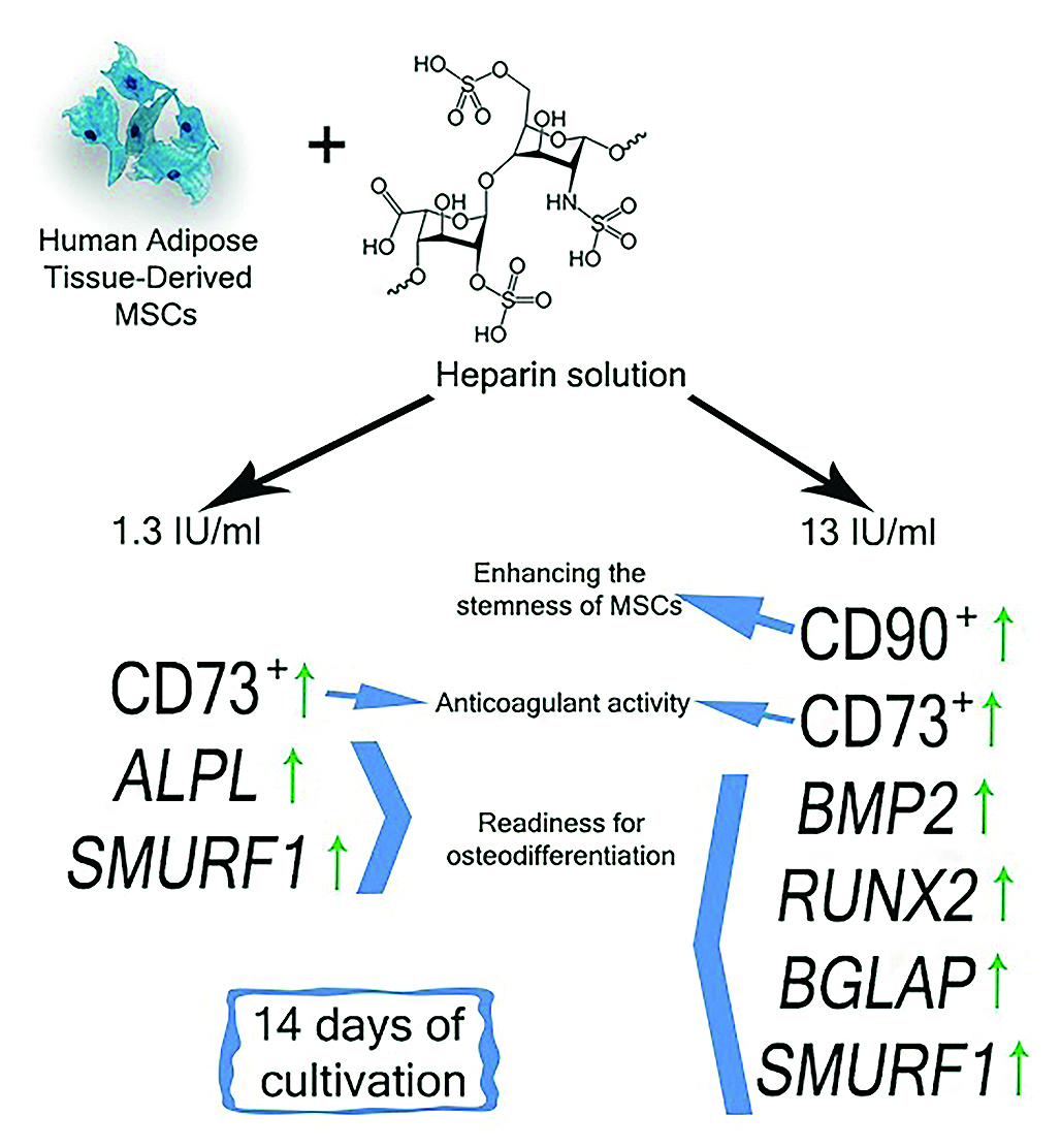 Результаты и обсуждение. По результатам проточной цитометрии было выявлено, что добавление гепарина в обеих используемых в исследовании концентрациях в культуру ММСК приводит к увеличению числа клеток, экспрессирующих поверхностные маркеры CD73 и CD90, что свидетельствует о сохранении их стволового состояния. С другой стороны, выявлено стимулирующее действие гепарина также в обеих используемых концентрациях на транскрипцию в ММСК мРНК генов остеодифференцировки (BMP2, BMP6, ALPL, RUNX2, BGLAP и SMURF1), что может указывать на остеогенный потенциал гепарина для исследуемой культуры клеток.