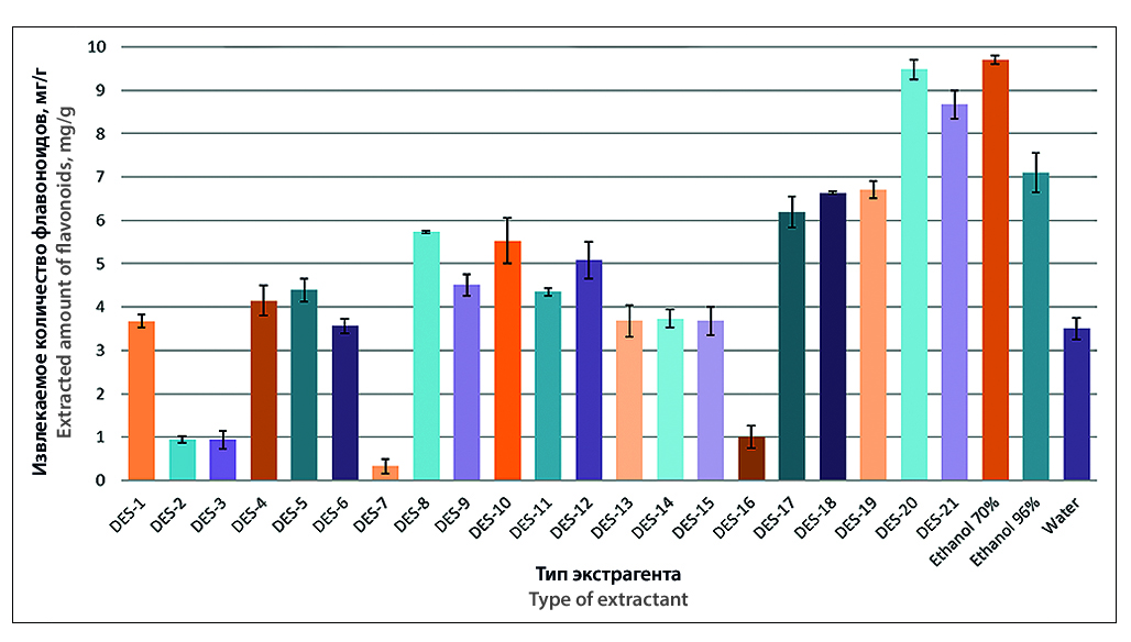 Введение. Природные глубокие эвтектические растворители [deep eutectic solvents (DESs)] являются перспективными экстрагентами для многих биологически активных веществ (БАВ) из растительного сырья. Они биодеградируемы, безопасны, стабильны, их производство доступно и легко осуществимо, а эффективность экстракции сопоставима с известными органическими растворителями. В связи с этим интерес к глубоким эвтектическим растворителям неуклонно растет в последние годы, и они находят применение в различных областях – химии, фармацевтике и пищевой промышленности.
