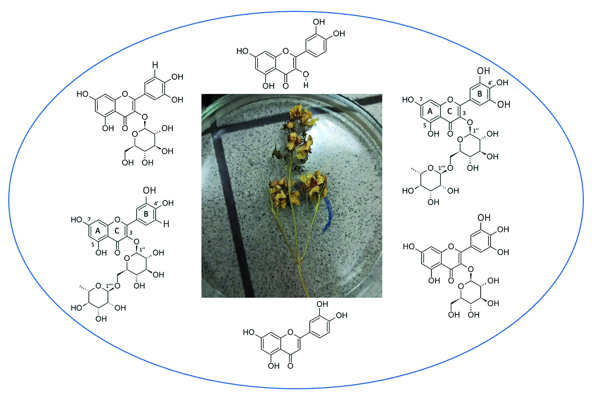 Результаты и обсуждение. В результате фитохимического изучения травы L. vulgaris были выделены и установлены структуры семи индивидуальных соединений (1–7). Соединение 1 и 2 представляют собой лютеолин и кверцетин, соответственно, в то время как соединения 3–7 представляют собой гликозиды кверцетина, мирицитина и кемпферола, а именно мирицетин-3-О-β-D-рутинозид (3), мирицетин-3-О-β-D-глюкопиранозид (4), кверцетин-3-О-β-D-рутинозид (рутин) (5), кверцетин-3-О-β-D-глюкопиранозид (6), кемпферол-3-О-β-D-рутинозид (7).