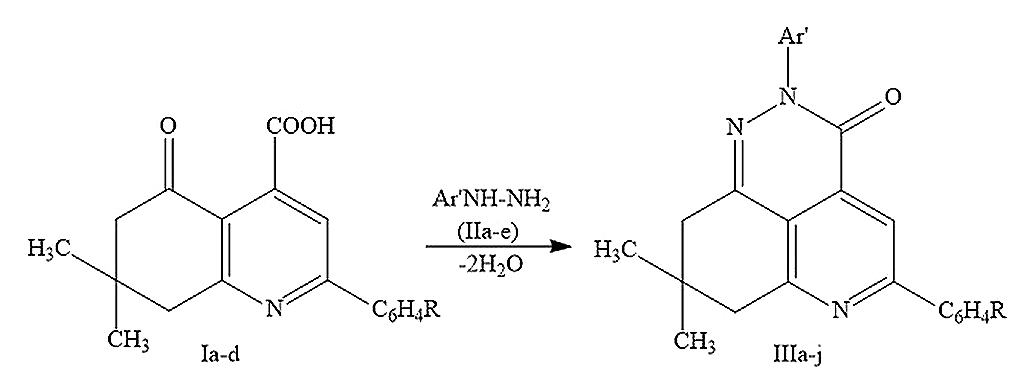 Материалы и методы. Соединения ряда 2,5-диарил-8,8-диметил-3,6,7,8-тетрагидро-2Н-пиридо[4,3,2-de]хиннолин-3-оновбыли получены в результате взаимодействия 2-арил-7,7-диметил-5-оксо-5,6,7,8-тетрагидрохинолин-4-карбоновых кислот c o-толил-, п-толил-, п-фтор-, п-нитро-, 2,4,6-трихлор-фенилгидразинами. В результате было синтезировано 10 веществ, структура которых была подтверждена данными ИК- и 1Н ЯМР-спектроскопии. Изучение антигипоксической активности полученных соединений проводилось на модели нормобарической гипоксии с гиперкапнией («баночной» гипоксии).