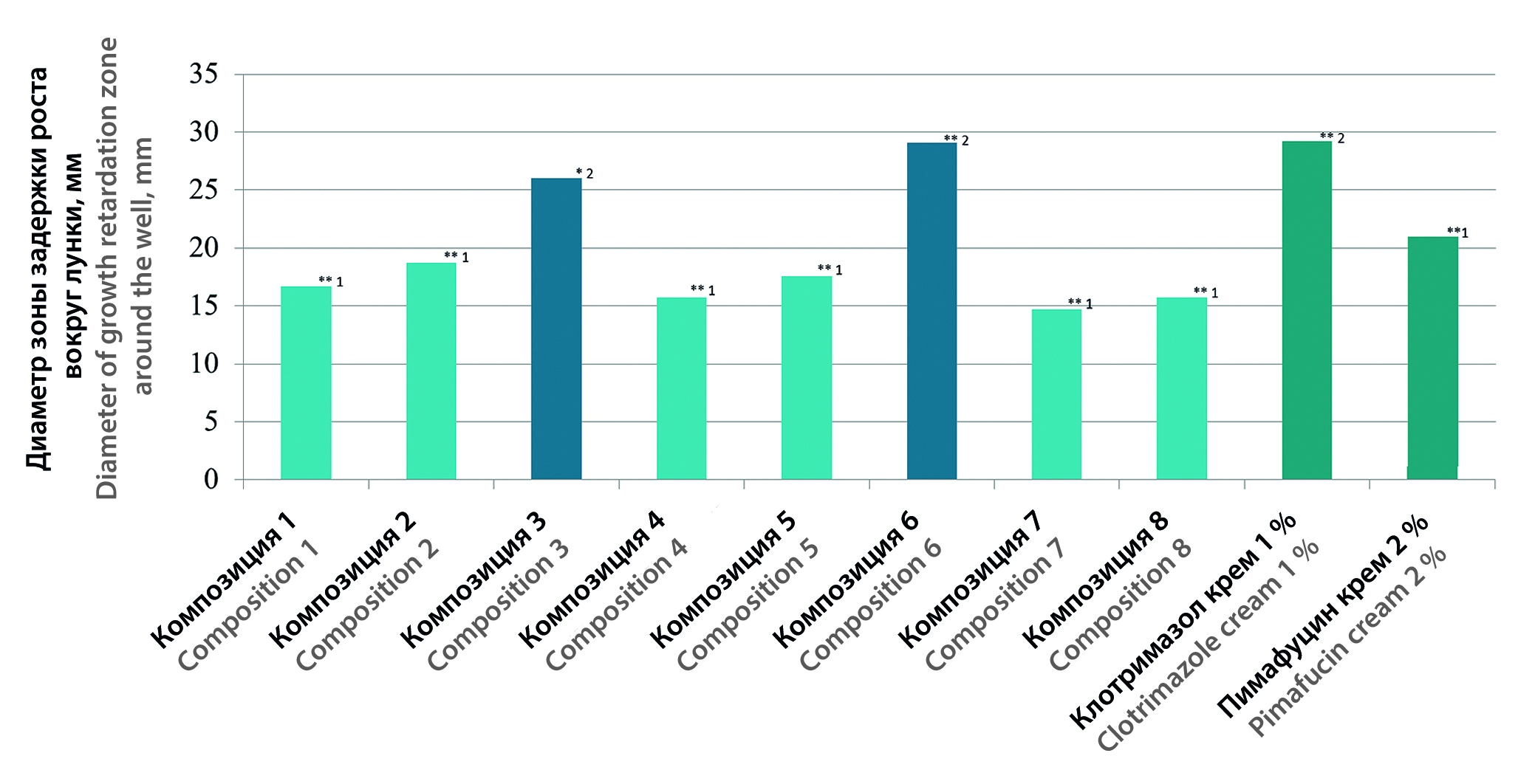 Результаты и обсуждение. Все изученные экспериментальные мягкие лекарственные формы проявили противогрибковое действие различной степени выраженности. Наибольший фармакологический эффект обнаружен у мазевых композиций на основе гидрофильных компонентов натрий-карбоксиметилцеллюлозы и полиэтиленоксидов. Их противогрибковое действие сопоставимо или превышает эффект препаратов сравнения.