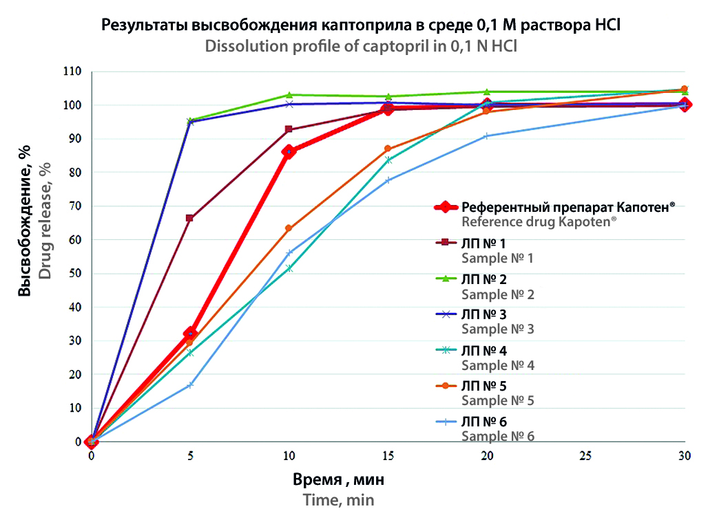 Цель. Целью настоящего исследования являлась сравнительная оценка лекарственных препаратов с МНН «Каптоприл» различных производителей, представленных на рынке РФ, на основании исследований однородности дозирования и теста кинетики растворения как критериев оценки качества объектов.