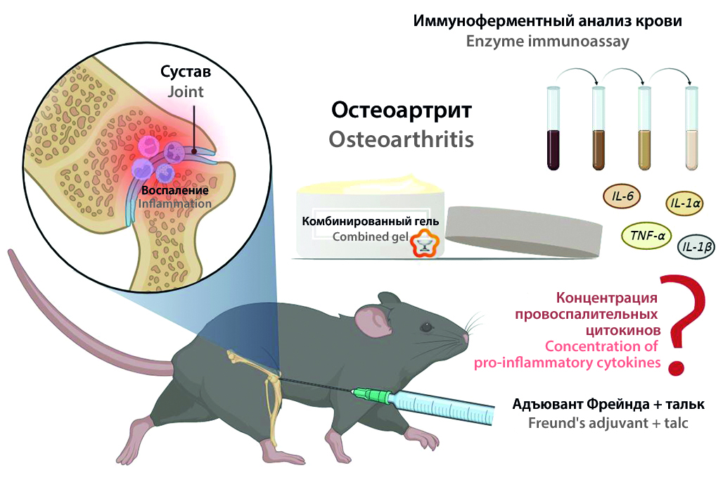 Материалы и методы. В эксперимент было включено 25 животных, которых методом простой рандомизации разделили на 5 групп: 1 – испытуемая (гель 0,5 %), 2 – испытуемая (гель 1 %), 3 – референтная (Амелотекс®, гель 1 %), 4 – контроль (гелевая основа); 5 – интакт. Доклиническое моделирование патологии было проведено путем сочетанного введения в полость скакательного (заплюсневого) сустава крыс самцов линии Brown Norvay Catholic Rats по 0,1 мл смеси полного адъюванта Фрейнда с 10 % суспензией талька в изотоническом растворе натрия хлорида в соотношении 1 : 10. Иммуноферментный анализ сыворотки крови животных на 28 день эксперимента проводили с помощью стандартных планшетных наборов ELISA (Cloud-Clone Corp., США). Статистическую обработку данных проводили с использованием программного обеспечения GraphPad Prism 8.0.2 (GraphPad Software Inc., США), различия считали статистически значимыми при р < 0,05.