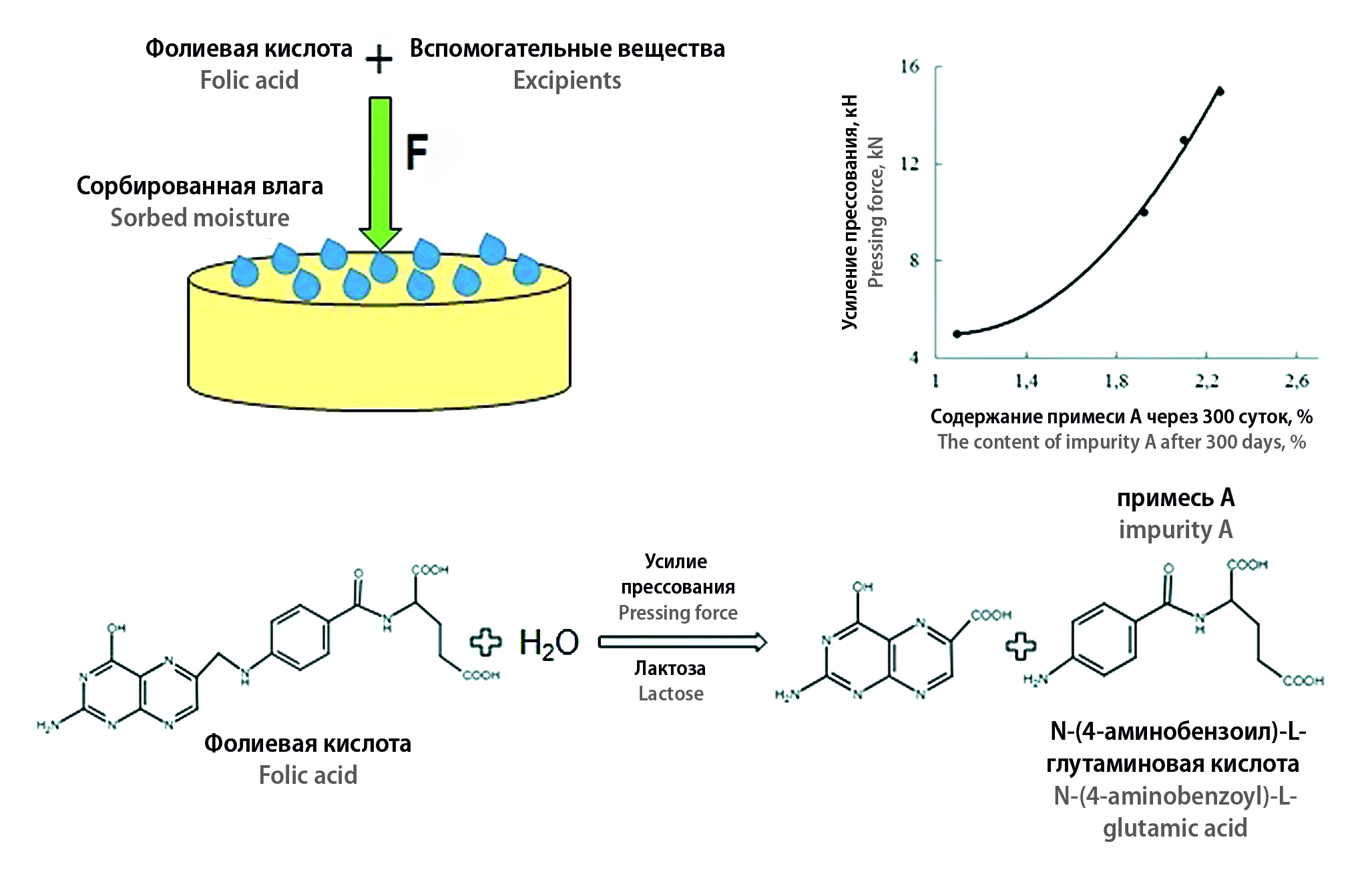 Введение. Вспомогательные вещества (ВВ) – неотъемлемый компонент лекарственных препаратов (ЛП). В тоже время ВВ, содержащиеся в них примеси и сорбированная вода являются одной из причин деградации активной фармацевтической субстанции (АФС). Такое влияние ВВ особенно важно оценивать для склонных к гидролизу АФС. Фолиевая кислота (ФК) гидролизуется под действием УФ-облучения и основным продуктом разложения является N-(п-аминобензоил)глутаминовая кислота (примесь А). При разработке ЛП «Фолиевая кислота таблетки, покрытые пленочной оболочкой, 1,0 мг» в процессе хранения нами было обнаружено увеличение содержания примеси А. Поскольку таблетки хранились в контурной ячейковой упаковке, состоящей из поливинилхлоридной пленки и алюминиевой фольги, в отсутствии УФ-облучения, причиной гидролиза ФК является состав таблеток и/или параметры процесса их получения.