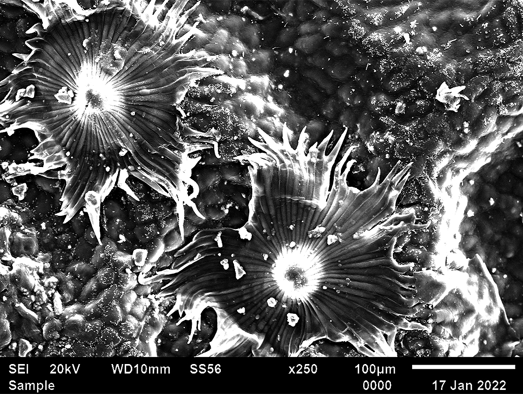 Материалы и методы. Объектом исследования служили высушенные цельные листья облепихи крушиновидной (Hippophaë rhamnoides L.), собранные в Воронежской области в 2021 году в период массовой зрелости плодов. Для проведения исследования методом растровой электронной микроскопии кусочки листьев предварительно напыляли золотом на автоматической напылительной установке Q150R ES (Quorum Technologies Ltd., Великобритания) для повышения проводимости. Микрофотографии получены на электронном микроскопе JSM-6510LV (JEOL Ltd., Япония).