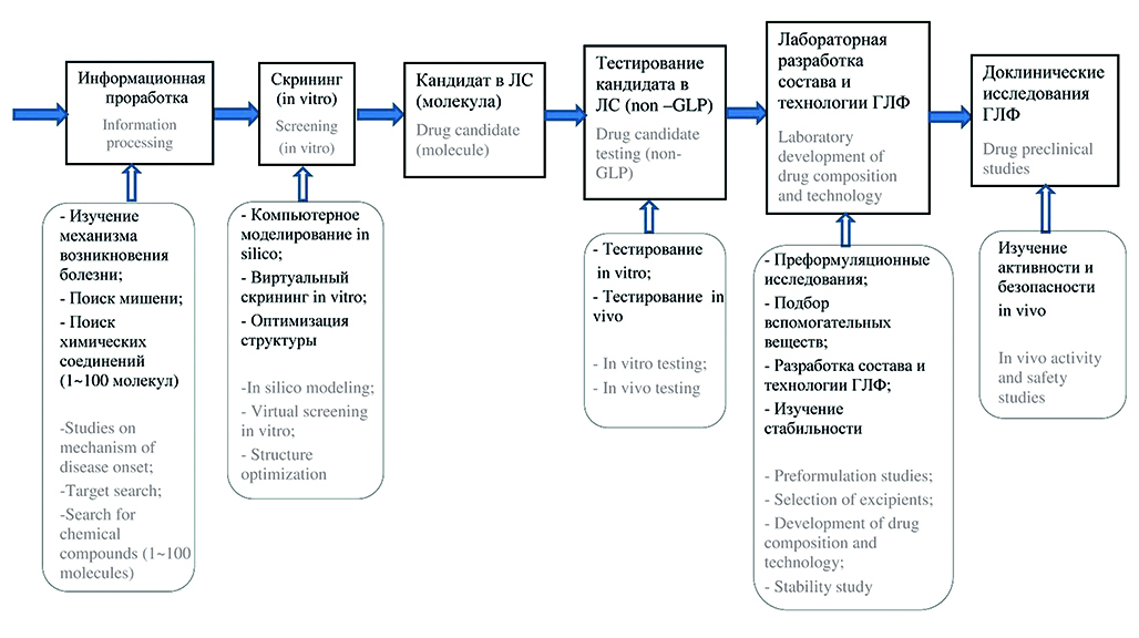 Текст. Цель настоящей работы заключается в создании обоснованного подхода к осуществлению лабораторной фармацевтической разработки с привлечением исследований in vivo. Включение доклинических исследований в процесс лабораторной фармацевтической разработки позволит исключить негативное влияние фармацевтических факторов на биодоступность лекарственного средства (ЛС), избежать ошибок при выборе вспомогательных веществ (ВВ), а также снизить материальные и временные затраты. Перечисленные в обзоре примеры, демонстрирующие актуальность проведения доклинических экспериментов на разных этапах лабораторной фармразработки, позволили описать более четкий алгоритм действий при осуществлении лабораторной фармацевтической разработки нового лекарственного препарата с момента выбора молекулы-кандидата в ЛС.