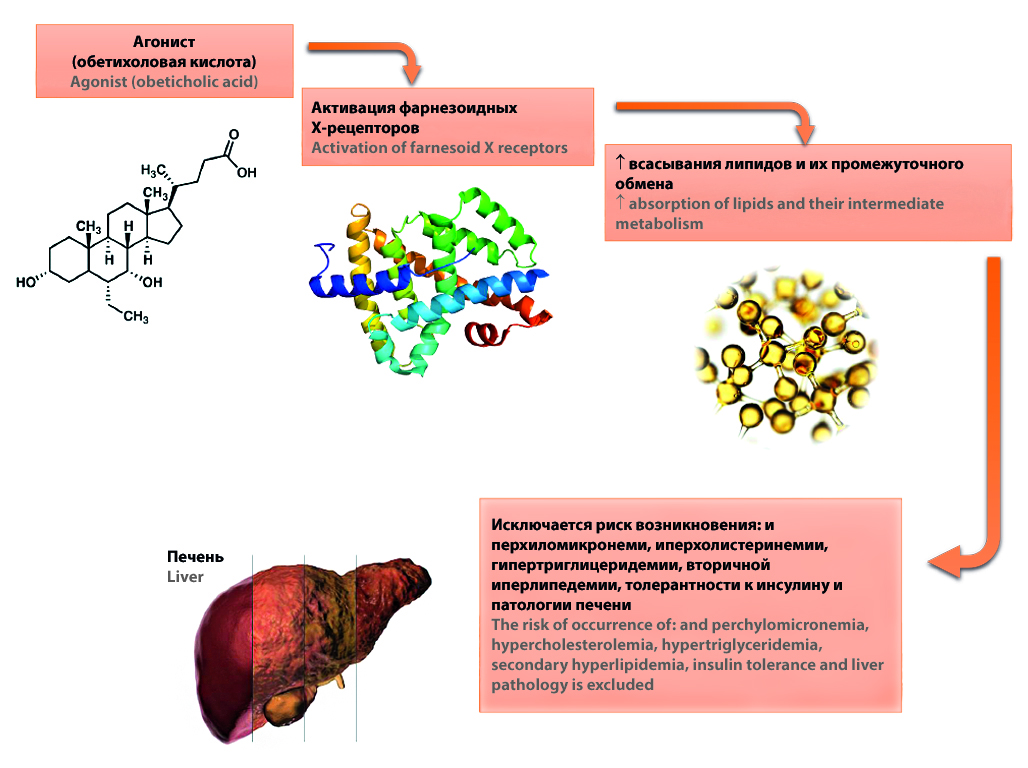 Заключение. Применение обетихолевой кислоты гармонизирует липидный обмен на фоне алиментарной жировой нагрузки за счет активации фарнезоидных Х-рецепторов кишечника и печени, что проявляется одновременным увеличением интенсивности процессов всасывания липидов и их промежуточного обмена. В результате исключается риск возникновения гиперхиломикронемии, гиперхолистеринемии и гипертриглицеридемии, снижается вероятность развития вторичной гиперлипедемии, толерантности к инсулину и функциональной перегрузки (или патологии) печени.