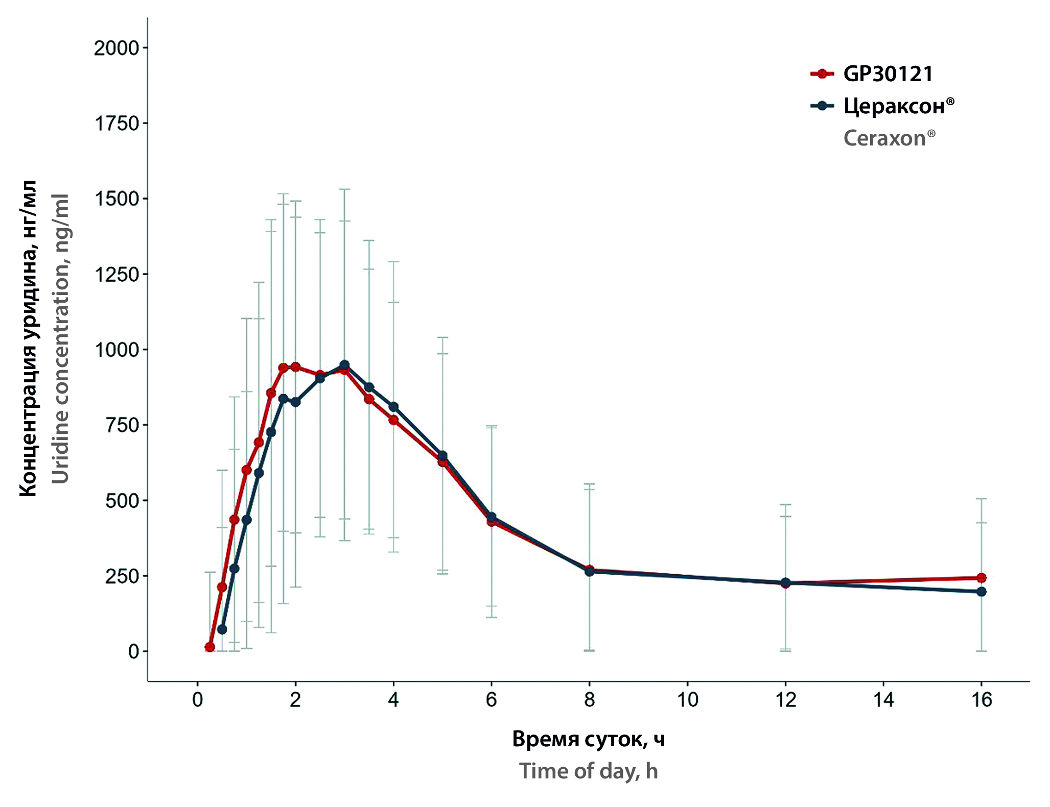 Цель. Целью данного исследования являлось изучение сравнительной фармакокинетики (ФК) и биоэквивалентности препаратов, содержащих цитиколин – GP30121 и Цераксон®, у здоровых добровольцев при приеме натощак.