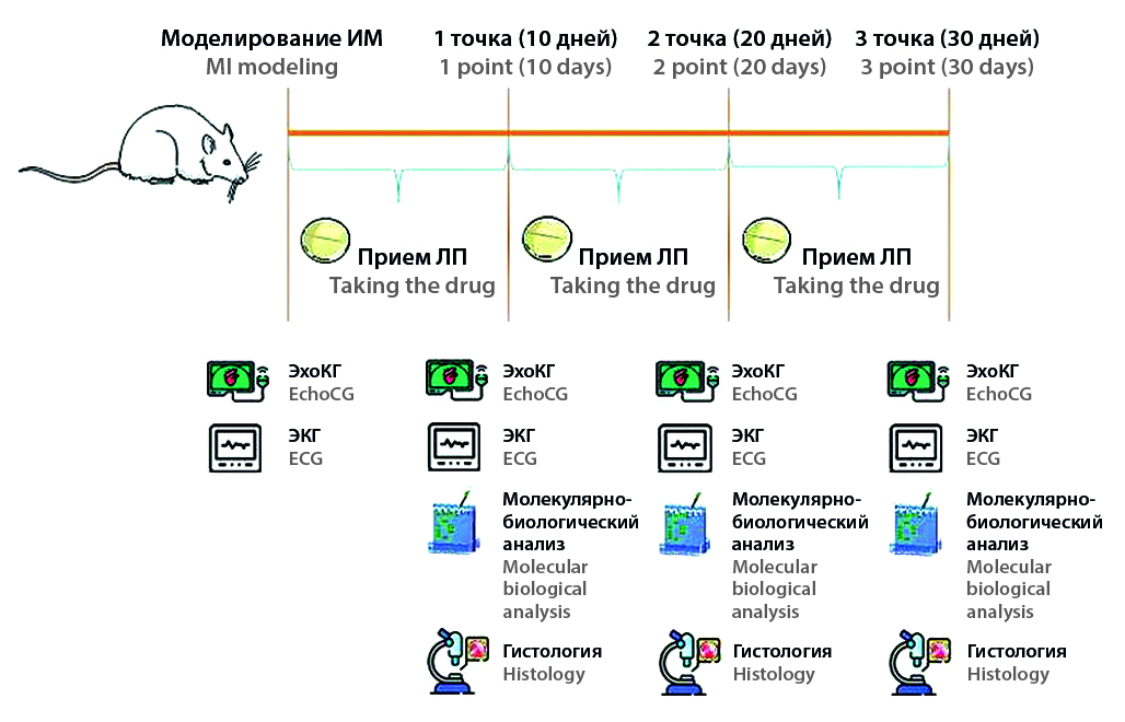 Цель. Целью данной работы являлись исследования эффективности эмпаглифлозина с использованием эхокардиографических, гистологических и молекулярно-биологических анализов в трех наиболее значимых точках динамического перехода от острого инфаркта миокарда к постинфарктной хронической сердечной недостаточности на лабораторных крысах-самцах.