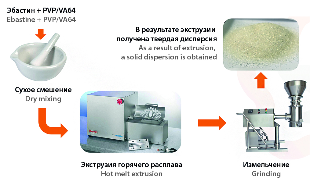Результаты и обсуждение. Разработана технология получения аморфной твердой дисперсии эбастина методом экструзии горячего расплава, значительно улучшены фармакокинетические свойства активного вещества, оптимизирован процесс получения твердой дисперсии, содержащей 20 % эбастина, с целью уменьшения содержания количества примесей в экструдате.