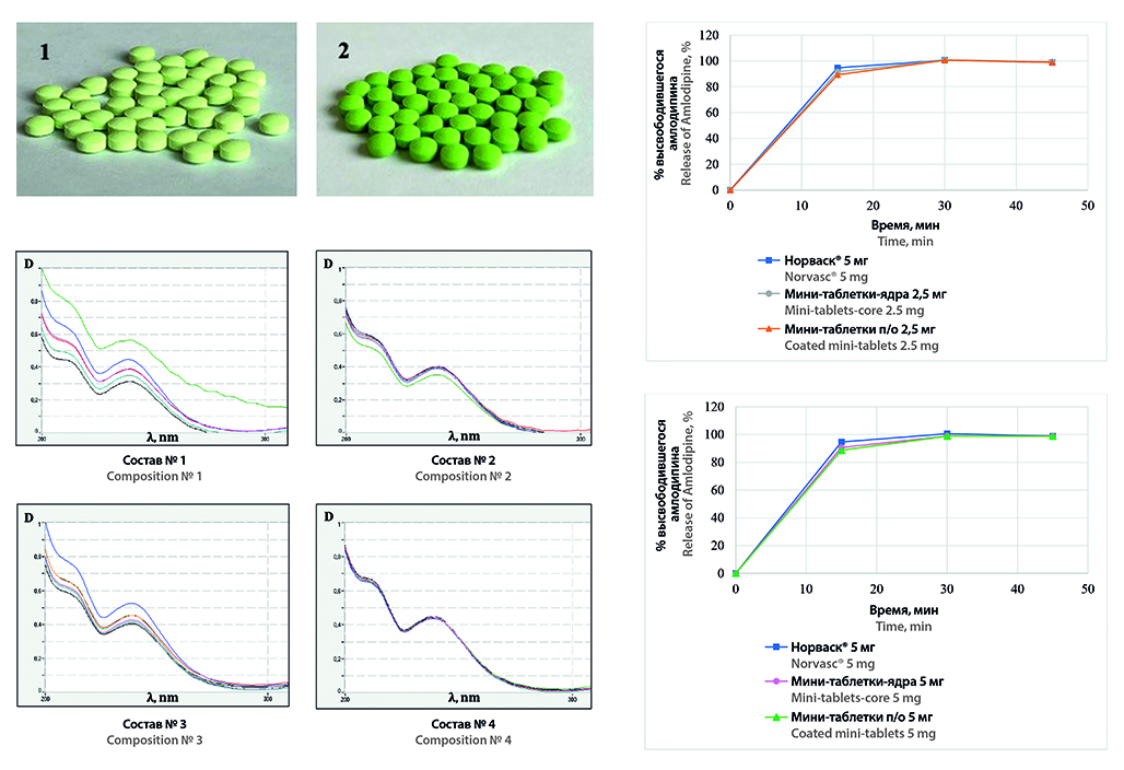 Заключение. Разработаны состав и технология мини-таблеток амлодипина 2,5 мг и 5 мг, покрытых пленочной оболочкой, являющихся одним из компонентов полипилла, содержащего оригинальную комбинацию ЛС для персонализированной терапии АГ.