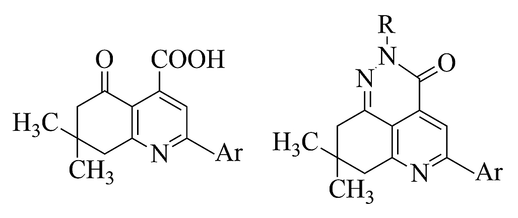 Взаимодействием 2-арил-7,7-диметил-5-оксо-5,6,7,8-тетрагидрохинолин-4-карбоновых кислот с бензил- и (2-фенилэтил)гидразинами получены 5-арил-2-бензил- и 2-(2-фенилэтил)-8,8-диметил-3,7,8,9-тетрагидро-2Н-пиридо[4,3,2-de]циннолин-3-оны (VII–XII). В результате было синтезировано 12 соединений. Изучение антигипоксической активности полученных соединений проводилось in vivo на модели нормобарической гипоксии с гиперкапнией.