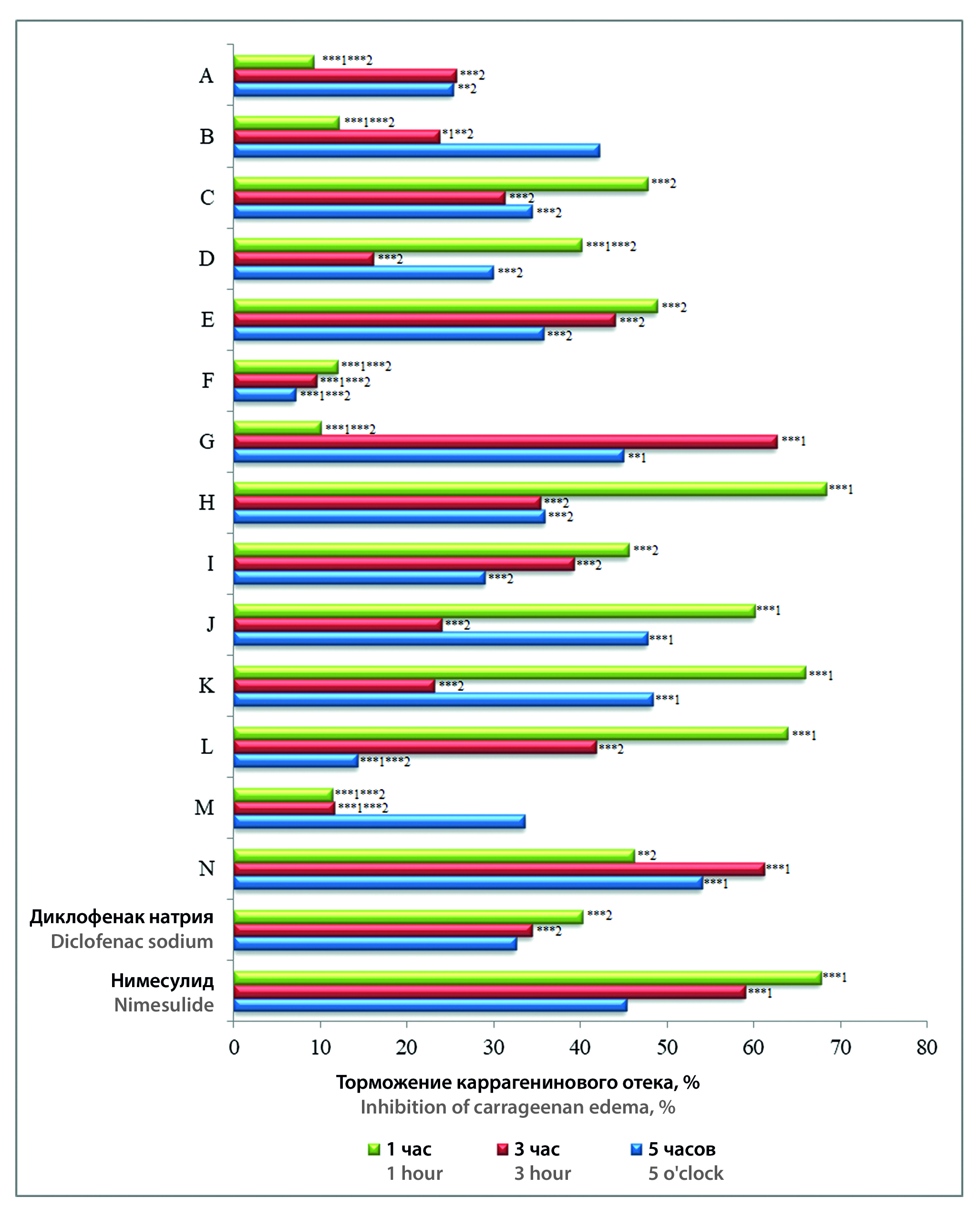 Заключение. Изучена противовоспалительная активность четырнадцати 2-гидрокси-4-оксо-4-R-2-бутеноатов гетариламмония. Пять бутеноатов оказывают действие ниже препаратов сравнения, восемь соединений сопоставимы с действием референтных препаратов, одно соединение превосходит нимесулид. Изученные соединения могут быть отнесены к 4,5 классу классификации опасности химической продукции. Выбраны лекарственные кандидаты для дальнейшего фармакологического, токсикологического и технологического изучения.