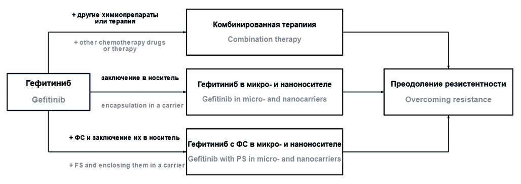 Заключение. В результате проведенного анализа литературных данных показано, что, несмотря на то, что гефитиниб является препаратом первого поколения, зарубежные и российские исследователи считают его достаточно перспективным для дальнейшего применения при терапии НМРЛ. При этом разработки ведутся как в области расширения комбинированной терапии, так и в области создания комплексных структур направленного действия, в которые, кроме гефитиниба, введены фотосенсибилизаторы или другие соединения, обладающие фото- или термочувствительными эффектами.