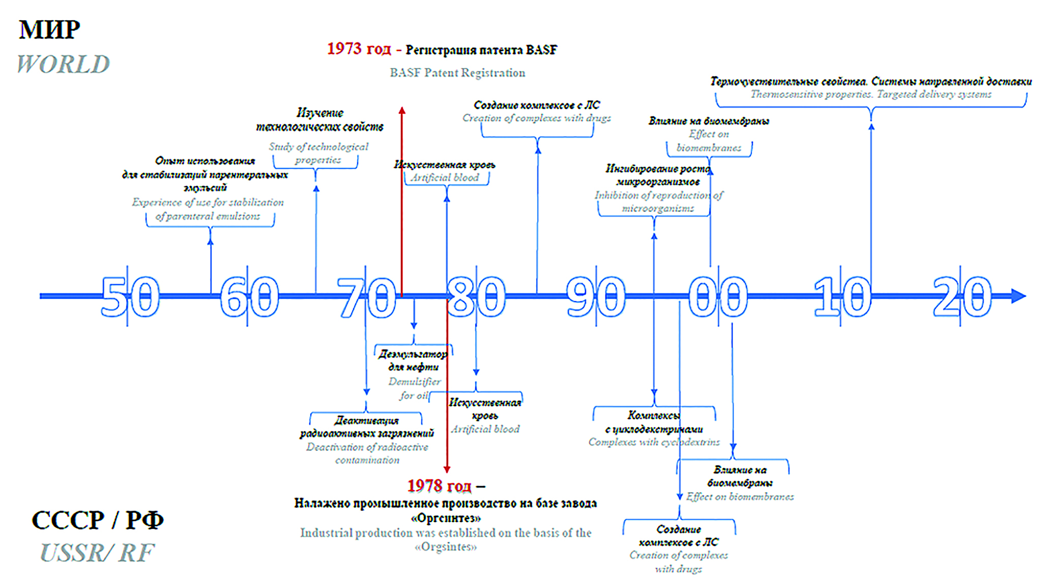 Заключение. Как показал ретроспективный анализ, у современной российской промышленности достаточно опыта и ресурсов для налаживания синтеза блок-сополимеров ПЭО и ППО, необходимых для производства лекарственных препаратов и разработки инновационных систем доставки лекарств. По материалам проведенного систематического обзора был впервые составлен наиболее полный реестр известных марок блок-сополимеров ПЭО и ППО, синтезированных за последние 50 лет в нашей стране и за рубежом, с подробной характеристикой их физико-химических свойств.
