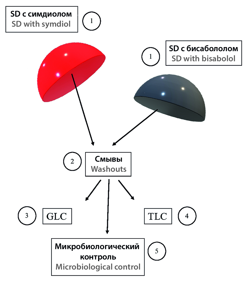 Материалы и методы. В качестве БАВ выбраны симдиол и бисаболол – вещества с доказанными антимикробными, противовоспалительными и увлажняющими свойствами. Использовали бисаболол в виде препарата «Драгосантол 100» и симдиол в виде «SymDiol 68Т». В качестве имитационной модели силиконовых лайнеров использовали силиконовые диски (СД), импрегнированные БАВ (0,2 % от объема). Высвобождение БАВ из имитационных моделей силиконовых лайнеров контролировали методами тонкослойной и газожидкостной хроматографии.