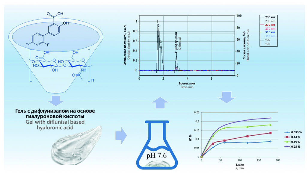 Результаты и обсуждение. Разработана методика определения дифлунизала в матрице гиалуроновой кислоты методом ВЭЖХ. Высвобождение действующего вещества из матриц проводили в среде фосфатного буферного раствора с рН 7,6. Исследуемая система доставки значительно увеличивает растворимость дифлунизала в водном растворе по сравнению с растворением субстанции. Степень высвобождения для всех образцов превышает 90 % через 3 часа после начала эксперимента, при этом большая часть действующего вещества высвобождается в течение часа.