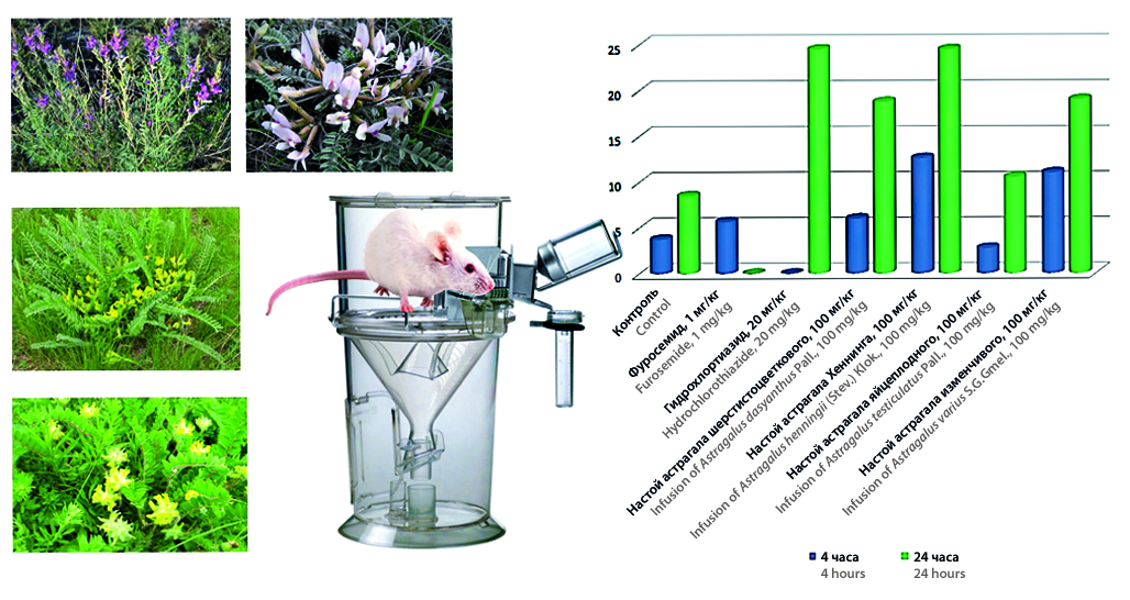 Материалы и методы. Изучение диуретической активности водных извлечений из травы четырех видов астрагала было выполнено на 42 белых крысах-самцах, которые были разделены на 6 опытных и контрольную группы по 6 животных. Водные извлечения из травы астрагалов готовили в соотношении сырье – экстрагент 1 : 10, все полученные настои соответствовали требованиям, предъявляемым к данным лекарственным формам согласно ОФС ГФ РФ XIV издания. Водные извлечения вводились животным внутрижелудочно через зонд в дозе 100 мг/кг. Во время проведения эксперимента собирались 4-часовые и 24-часовые порции мочи. Препаратом сравнения в 4-часовом эксперименте был фуросемид в дозе 1 мг/кг, а в 24-часовом опыте – гидрохлортиазид в дозе 20 мг/кг.