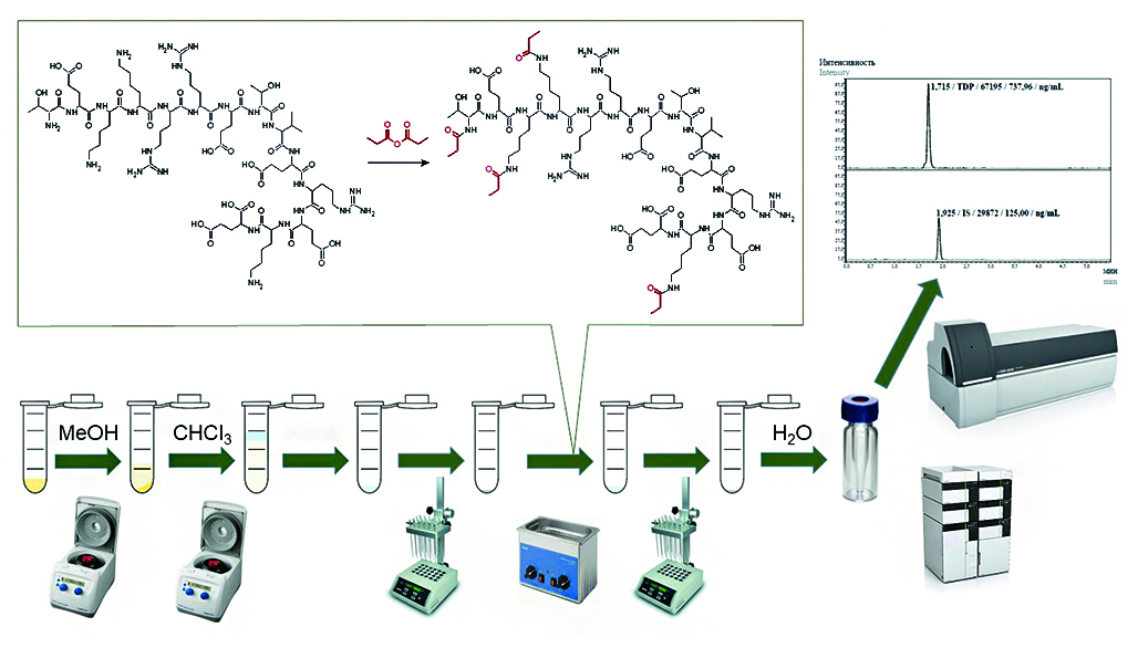 Материалы и методы. Определение ТДП в плазме крови человека проводили методом ВЭЖХ-МС/МС. При пробоподготовке использована комбинация методов осаждения белков плазмы крови раствором пропионовой кислоты в метаноле, жидкость-жидкостной экстракции, дериватизации пептида пропионовым ангидридом. Внутренний стандарт (ВС): треонил-глутамил-лизил-лизил-аргинил-аргинил-глутамил-треонил-лейцил-глутамил-аргинил-глутамил-лизил-глутамат. Хроматографическое разделение проводили в градиентном режиме, элюент А – 0,1%-й раствор муравьиной кислоты в воде, элюент В – 0,1%-й муравьиной кислоты в ацетонитриле. Колонка: Waters XBridge C18, 4,6 × 50 мм, 5 мкм. Ионизация методом электрораспыления в положительном режиме. При детектировании в режиме мониторинга множественных реакций (multiple reaction monitoring, MRM) для 4-замещенного ТДП пропионата использовали переходы: 681,30 → 73,95 m/z, 681,30 → 84,00 m/z, 681,30 → 101,90 m/z, 681,30 → 140,10 m/z, для 4-замещенного ВС пропионата: 686,00 → 74,10 m/z, 686,00 → 84,05 m/z, 686,00 → 102,00 m/z, 686,00 → 140,00 m/z.