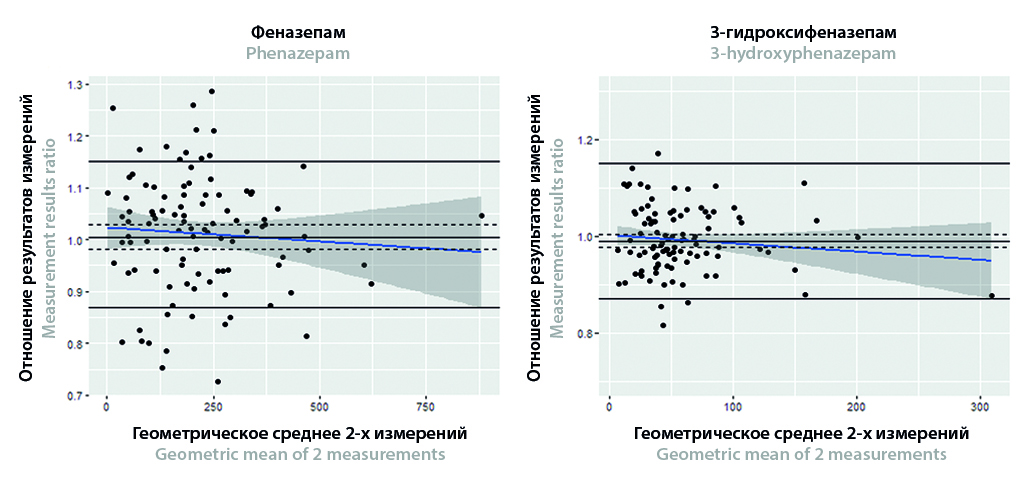 Результаты и обсуждение. Для обоих аналитов были получены регрессионные зависимости между концентрациями, измеренными разными методами пробоподготовки. 95%-й доверительный интервал (ДИ) коэффициентов обоих уравнений включал единицу, а 95%-й ДИ свободного члена включал ноль. 95%-й ДИ геометрического среднего индивидуальных отношений SLE/SPE находился в пределах допустимого диапазона (0,87; 1,15). Данные результаты подтверждают отсутствие влияния количественной методики на измерение концентрации обоих аналитов. 66,7%-й ДИ относительной погрешности между двумя измерениями находился в допустимых пределах (–0,2; 0,2), не превышая 20%-й диапазон от их среднего значения. Это подтверждает приемлемую прецизионность между методиками. Вычисленные доверительные интервалы отражены на диаграммах аналитического смещения по Бленду – Альтману.