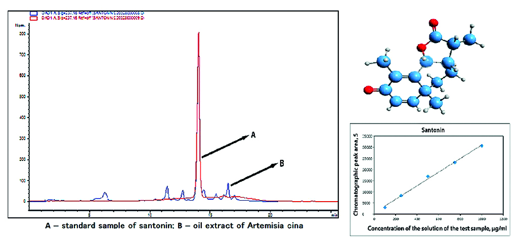 Заключение. Разработана методика идентификации и количественного определения масляного экстракта по основному действующему веществу – сантонина методом жидкостной хроматографии.