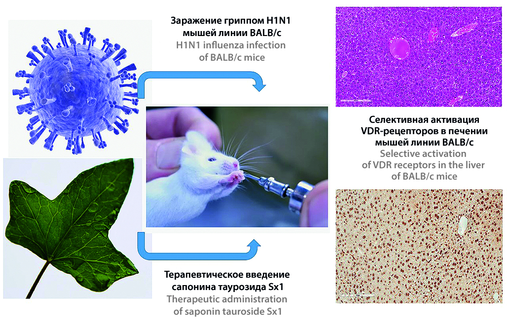 Цель. Исследовать влияние перорального введения сапонина таурозида Sx1, полученного из крымского плюща, на продолжительность жизни и активацию рецепторов к витамину D в печени мышей при гриппозной инфекции различной степени тяжести.