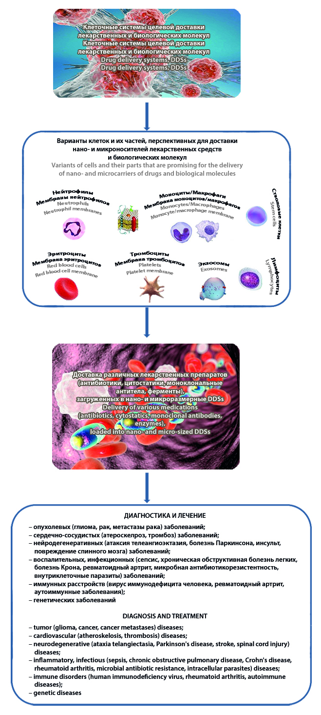 Текст. В обзоре в сжатом виде рассмотрены фундаментальные и прикладные вопросы разработки клеточных DDSs, морфофункциональное разнообразие которых теоретически позволяет решать задачи фармакотерапии различных заболеваний. Представлены источники, суммирующие клинические протоколы применения клеточных DDSs, которые ограничены тем не менее противоопухолевой и противовоспалительной терапией. Описываются достоинства, а также частные и общие недостатки использования тех или иных клеток (клетки крови, иммуноциты, стволовые клетки) как перспективных платформ для трансляции в клиническую практику средств доставки различных лекарственных препаратов (антибиотики, цитостатики, моноклональные антитела, ферменты и т. п.), загруженных в нано- и микроразмерные DDSs.