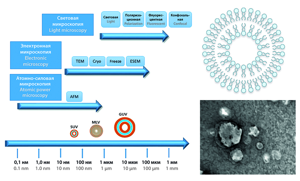 Текст. Существует широкий спектр методов визуализации, доступных для оценки морфологии липосом и их качества, каждый из которых имеет свои преимущества и недостатки: световая микроскопия, ESEM, TEM, AFM и пр. В целом выбор метода зависит от того, какие морфологические характеристики и степень детализации требуются. В процессе подготовки проб липосом важно понимать особенности образцов и метода визуализации. Адекватно проведенные исследования по фармакокинетике и биораспределению также могут расцениваться как инструмент визуализации липосом. Фармакокинетика липосомальных форм определяется множеством факторов, таких как природа ЛС, дозировка, липидный состав, размер липосом, заряд, покрытие липосом вспомогательными веществами и способ введения. Кроме того, взаимодействие липосомальных форм с иммунной системой, ретикулоэндотелиальной системой и компонентами крови играет важную роль в их абсорбции, распределении и выведении из организма.