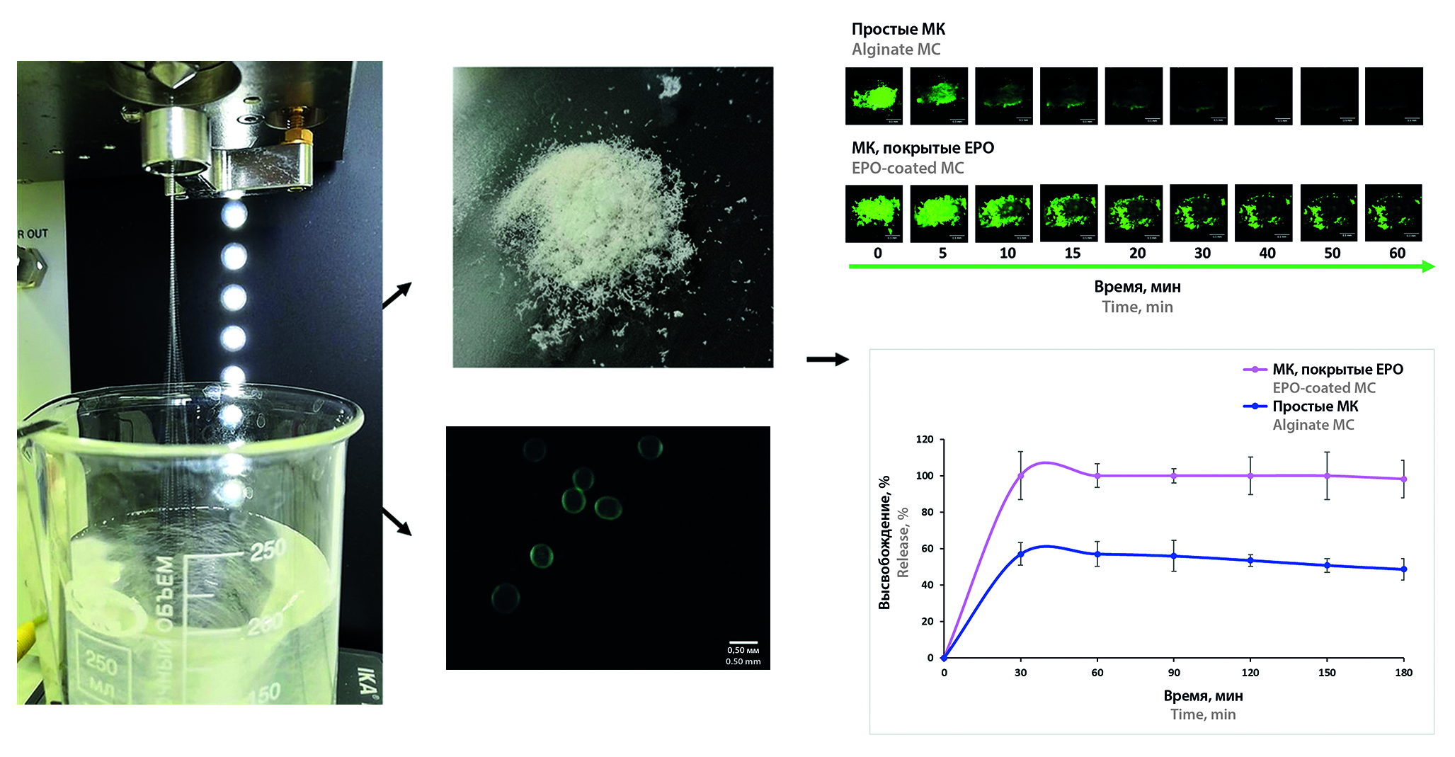Результаты и обсуждение. Разработана методика получения МК, подобраны параметры прибора и оптимальный состав микрочастиц. Было получено 2 типа МК: простые МК на основе альгината натрия и МК, покрытые Eudragit® ЕРО (ЕРО), обладающие мукоадгезивными свойствами. Средний диаметр простых МК составил 0,365 ± 0,018 мм, МК, покрытых ЕРО, – 0,426 ± 0,017 мм. Простые МК смываются с поверхности изолированной слизистой носа овцы через 5 мин после орошения ИНЖ, а МК, покрытые ЕРО, удерживаются в течение 1 ч. ЭИ% МК леводопой выше 90 %. ЕЗ% МК, покрытых ЕРО, больше, чем у простых МК. Выход леводопы в среду ИНЖ из МК, покрытых ЕРО, составил 100 % уже через 30 мин исследования, у простых МК – не более 60 ± 6,1 % через 3 ч.