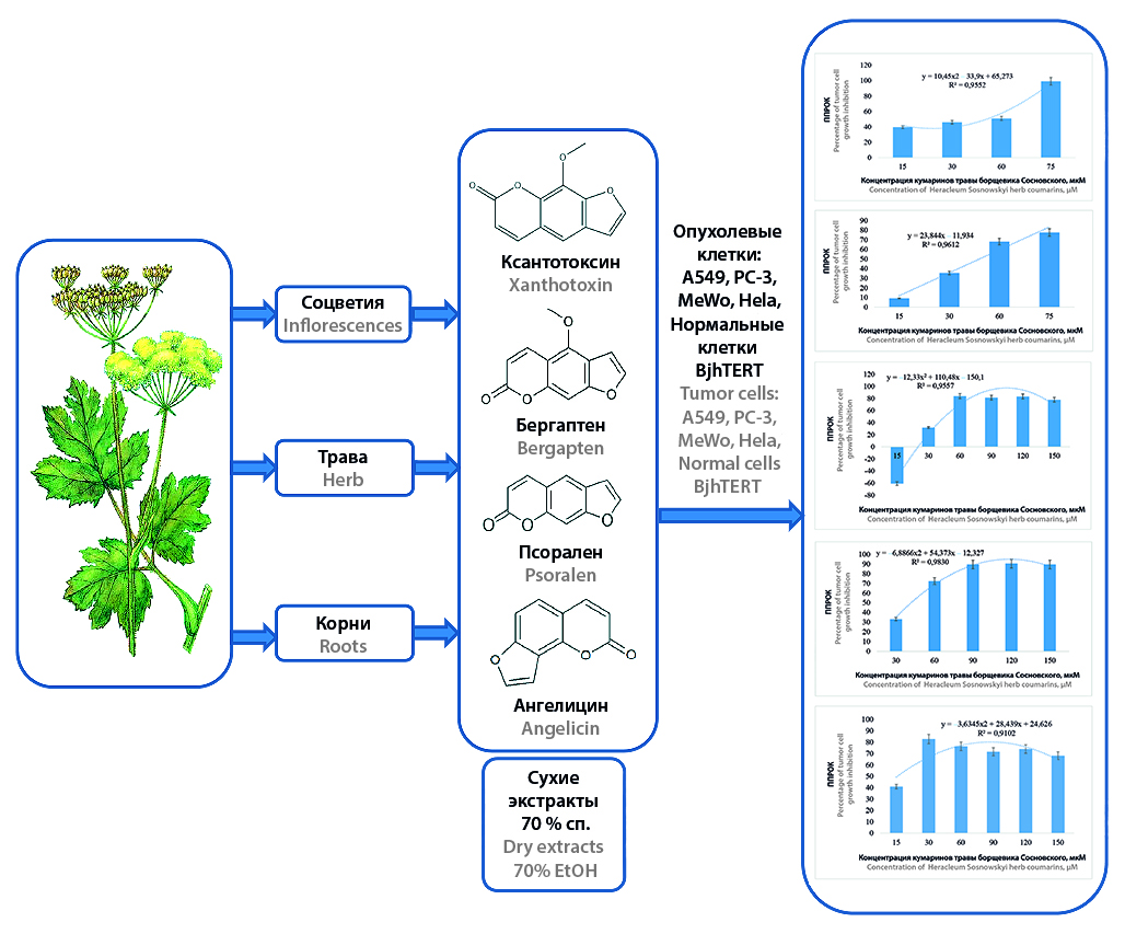 Материалы и методы. Объект исследования – воздушно-сухие трава и соцветия, заготовленные в период цветения, и корни, собранные в период отмирания надземной части, борщевика Сосновского. Получали водно-спиртовые извлечения, из которых отгоняли растворитель, полученный сухой остаток растворяли в фосфатно-солевом буфере с рН 7,4. Идентификацию и количественное определение кумаринов проводили методом высокоэффективной жидкостной хроматографии. Противоопухолевый (цитостатический) эффект in vitro изучали на следующих культурах клеток: карциномы легкого А549, аденокарциномы предстательной железы РС-3, меланомы кожи MeWo, аденокарциномы шейки матки Hela и иммортализованных фибробластов крайней плоти BjhTERT. Оценку жизнеспособности клеток выполняли в условиях МТТ-теста на планшетном спектрофотометре. Контроль метаболической активности осуществляли при помощи 4,5-диметилтиазолли-2-ил-2,5-дифенилтетразолия бромида. Формировали отрицательный контроль (буфер), контроль роста клеток, положительный контроль (доксорубицин) и исследуемые пробы.