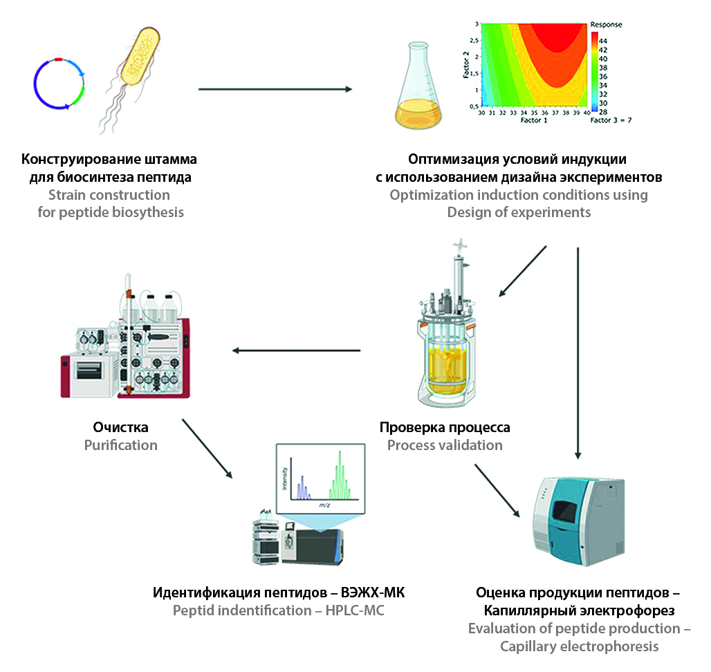 Материалы и методы. Генетические конструкции получили с использованием рестриктазно-лигазного метода, подлинность подтвердили секвенированием по Сенгеру. Технологию культивирования разработали с использованием подхода Design of experiments. Валидацию условий культивирования проводили в биореакторе Biostat B. Гибридные белки очищали методом металл-хелатной хроматографии, целевые пептиды получали гидролизом с помощью ULP-протеазы. Количественное содержание целевого белка определяли капиллярным электрофорезом, подлинность белка – ВЭЖХ-МС и косвенным неконкурентным ИФА.