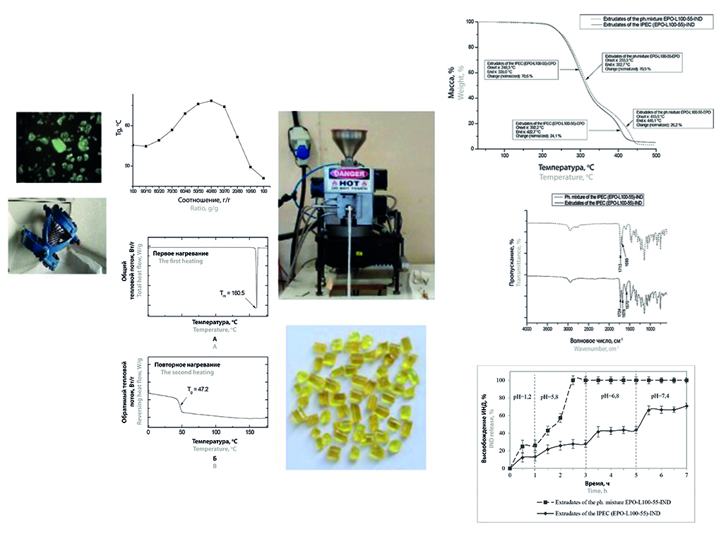 Введение. В результате исследования методом реактивной термоэкструзии (РТЭ) было получено 4 типа гранул с индометацином на основе сополимеров Eudragit® марок ЕРО и L100-55, их физической смеси (ФС), аналогичной по составу синтезированному интерполиэлектролитному комплексу (ИПЭК) ЕРО/L100-55 – 1,95 : 1 (по молям). Проведенная с использованием метода модулированной ДСК отработка условий термоэкструзии показала применимость данного подхода для предварительного моделирования происходящих процессов. Охарактеризованные с использованием методов термического и спектрального анализа полученные гранулы включают индометацин в аморфной форме, образующейся из исходной γ-формы в результате РТЭ образцов. Изучение высвобождения индометацина из полученных гранул в моделирующих продвижение по ЖКТ условиях показало перспективность всех видов разработанных систем для создания конструкций с направленным высвобождением ЛВ в модельные буферные среды, соответствующие голодному или сытому желудку, а также верхним отделам тонкой кишки (ЕРО и ФС ЕРО/L100-55), слепой и правой половины толстой кишки (L100-55) и проксимального отдела толстой кишки (ИПЭК). В последнее время вследствие выраженной пластичности, обусловленной низкой температурой стеклования (Тс), многие типы сополимеров Eudragit® (Е, RL, RS, FS, NE, NM) находят все более широкое применение в интенсивно развивающейся области фармацевтической технологии – гранулировании методом термоэкструзии, получившей название pharmaceutical melt extrusion (PME). Несмотря на прогрессирующее количество исследований по использованию PME-метода, исследования по изучению возможности применения поликомплексных систем на основе сополимеров семейства Eudragit® незаслуженно отсутствуют. При этом известно, что комбинирование противоположно заряженных пар термопластичных эудрагитов при использовании технологии термоэкструзии позволяет разрабатывать пероральные системы доставки с регулируемой проницаемостью полимерных звеньев в структуре оболочек пеллет вследствие образования интерполимерно связанных участков цепей реагирующих макромолекул в процессе высвобождения лекарственных веществ (ЛВ) в моделирующих желудочно-кишечный тракт (ЖКТ) средах с прогрессирующим ростом значений рН от желудка до толстой кишки. К сожалению, несмотря на то, что в литературе имеется множество примеров по применению метода термоэкструзии, включая и РТЭ для получения систем доставок ЛВ на основе сополимера Eudragit® ЕРО (ввиду его низкой Тс), практически отсутствуют исследования, в которых в качестве термоэкструзионного носителя использовался бы интерполиэлектролитный комплекс (ИПЭК) с участием химически комплементарных пар эудрагитов.