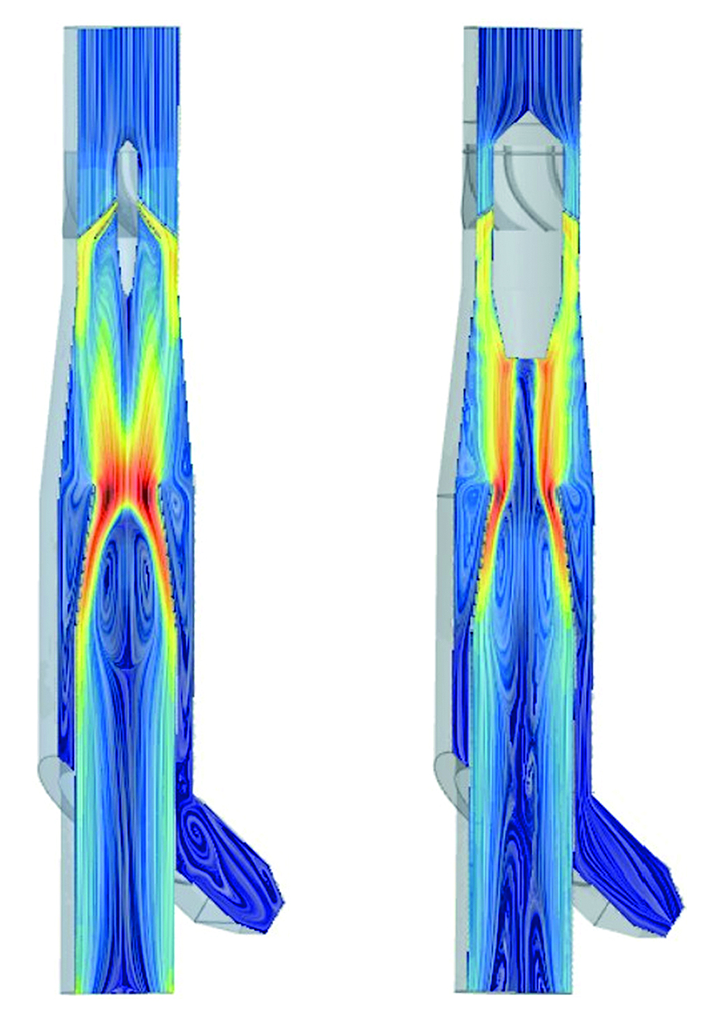 Результаты и обсуждение. CFD-модель аппарата позволила определить поле скоростей газа, траектории потока и эффективность улавливания частиц в исследуемых конфигурациях прямоточного циклона. На основании информации о поле скорости газа и траекторий потока сделаны выводы о наиболее эффективных конструкторских решениях. Сравнение результатов численного моделирования и результатов эксперимента показало хорошую сходимость.