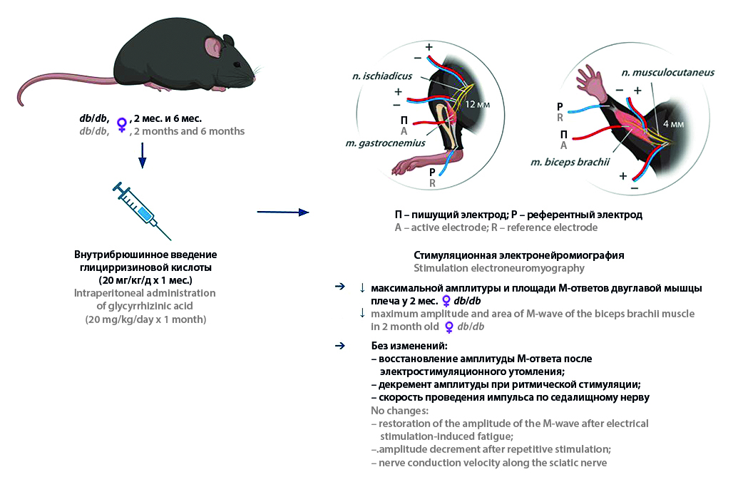 Цель. Изучение влияния глицирризиновой кислоты (ГК) (20 мг/кг/д) при курсовом введении (1 мес.) на нейромоторную функцию у разновозрастных лептинрезистентных диабетических мышей-самок db/db методом стимуляционной электронейромиографии (ЭНМГ).