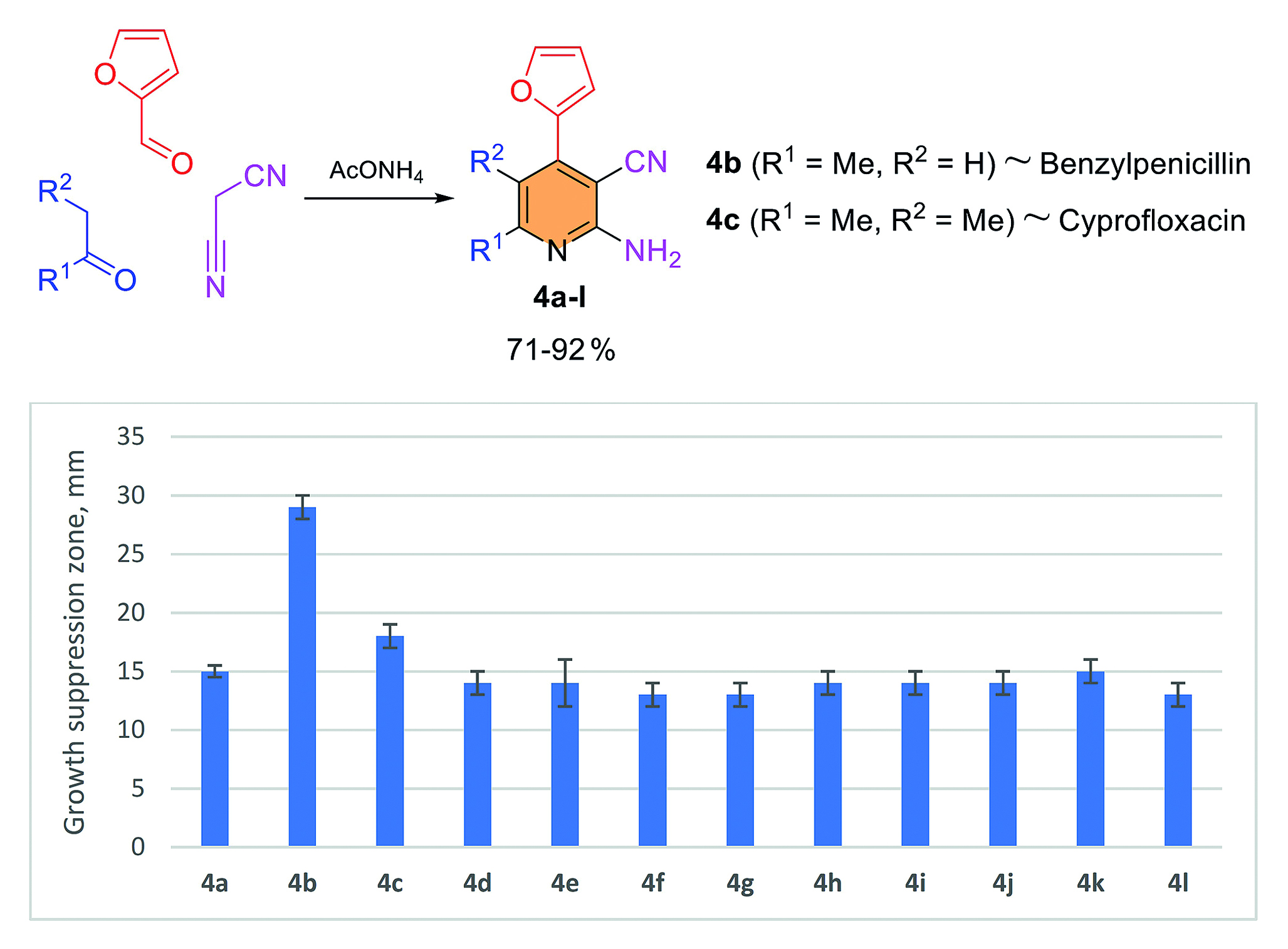 Введение. Соединения, содержащие в своем составе фурановый фрагмент, часто проявляют антимикробную активность. Несмотря на то что среди производных пиридина нет препаратов, проявляющих противомикробную активность, его комбинация с фурановым заместителем может рассматриваться как перспективный тандем для создания эффективных антимикробных препаратов.