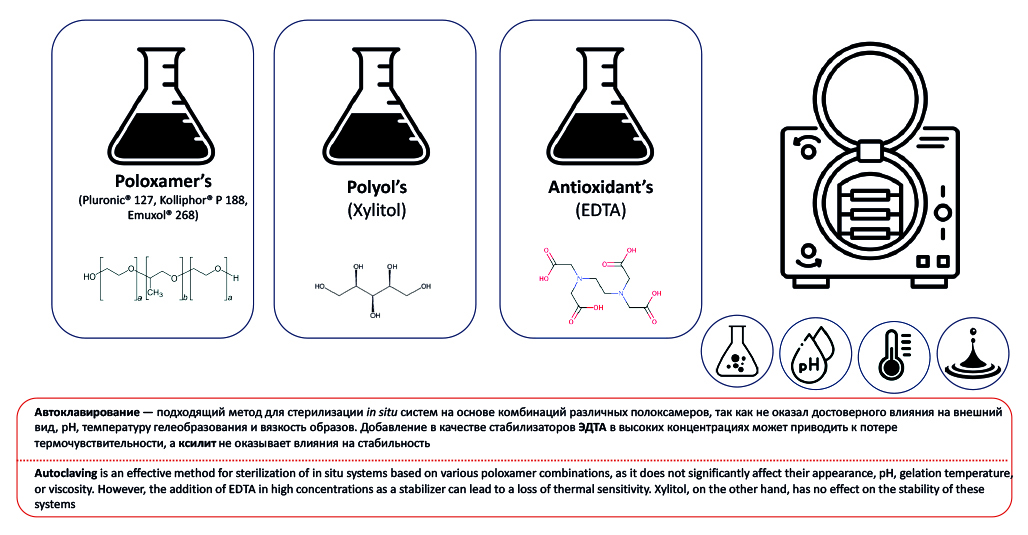 Введение. Парентеральные и офтальмологические in-situ-системы должны быть стерильными. Выбор метода стерилизации – ключевой этап в разработке стерильных стимулочувствительных систем, так как неподходящий метод может привести к разрушению гелеобразующего полимера и активной субстанции и потере активности. К сожалению, стабильность термочувствительных систем на основе полоксамеров при стерилизации, а также способы их стабилизации с помощью протективных агентов изучены недостаточно.