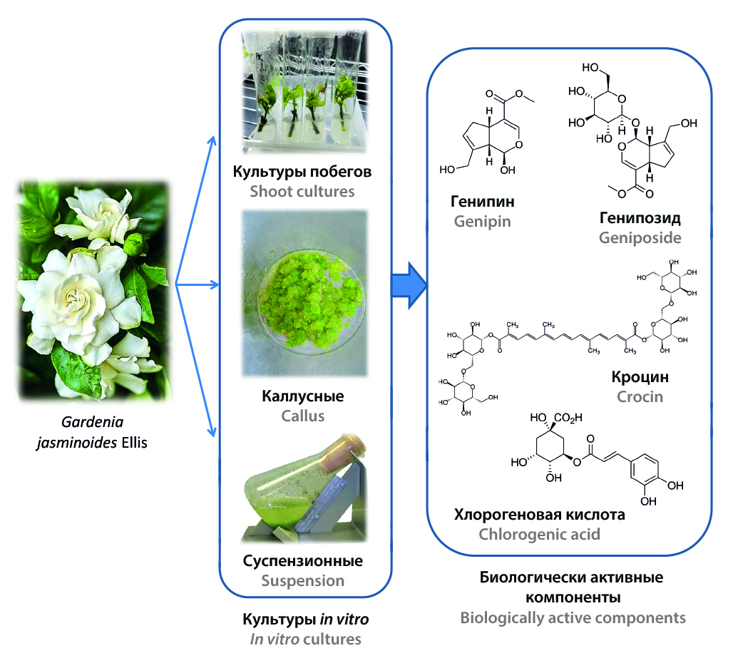 Текст. В настоящее время из интактного растения G. jasminoides выделено и идентифицировано около 162 соединений, среди которых флавоноиды, иридоидные гликозиды, желтый пигмент гардении, монотерпеноиды, сесквитерпеноиды, тритерпеноиды, органические кислоты и их производные. Наиболее важными биологически активными компонентами G. jasminoides являются иридоидные гликозиды и желтые пигменты – производные кроцина. Использование культур растительных клеток является одним из наиболее перспективных подходов к получению БАВ растительного происхождения, поскольку данный метод характеризуется меньшей зависимостью от климатических и экологических факторов, обеспечивает более точное управление процессом и позволяет сокращать производственный цикл, что способствует эффективному масштабированию производства. Рядом исследователей были получены каллусные и суспензионные культуры, а также культуры побегов и модифицированных корней G. jasminoides. С целью повышения продукции основных классов биологически активных веществ – иридоидных гликозидов, полифенольных соединений и каротиноидов – в каллусных, суспензионных и побеговых культурах гардении жасминовидной был проведен ряд исследований по введению в питательные среды специфических добавок. Было показано, что культуры клеток G. jasminoides обладают высокой антиоксидантной активностью благодаря фенольным соединениям, таким как феруловая и хлорогеновая кислоты. Экстракты каллусной культуры показали значительно большую супероксиддисмутазную активность, чем экстракты листьев. В то же время только экстракты каллусных культур проявляли антимикробную активность против Escherichia coli и Bacillus cereus.