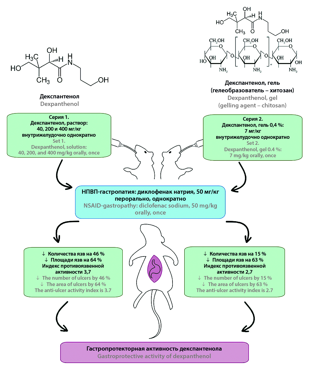 Цель. Доклинические исследования гастропротекторной активности декспантенола при приеме внутрь на модели гастропатии, индуцированной нестероидными противовоспалительными препаратами (НПВП-гастропатии).