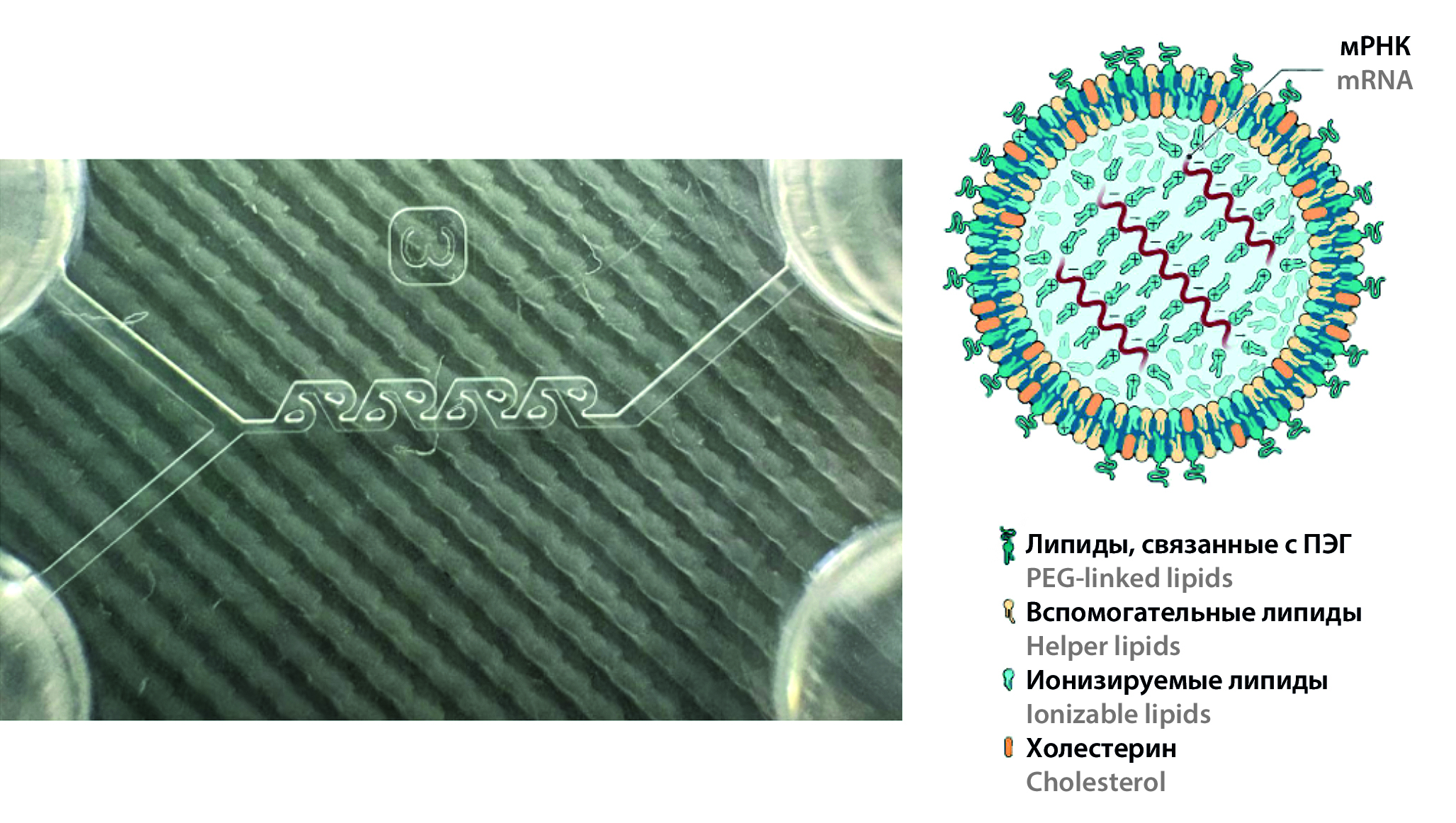Материалы и методы. Ионизируемый липид гептадекан-9ил(Z)-N-((4-диметиламино)бутил)тио)карбонил)-N-(2-(нон-2-ен-1-илокси)-2-оксоэтил)глицинат (ИЛ) и хелперные липиды – дипальмитоилглицерофосфат (DPPC), холестерол и a-(3’-[1,2-ди(миристилокси)пропанокси]карбониламино}пропил)-w-метоксиполиоксиэтилен (DMG-PEG2000). Растворители: абсолютный спирт, вода очищенная. Буферные растворы: ацетатный буферный раствор (рН 4,5), фосфатный буферный раствор (рН 7,4). Оборудование: микрофлюидная установка Dolomite (Dolomite Microfluidics, Великобритания), Y-образный полимерный микрофлюидный чип с пассивным микромиксером типа «катушка Тесла», анализатор наноразмерных частиц Nanosizer Zeta Pro (ООО «Микротрак», Россия).