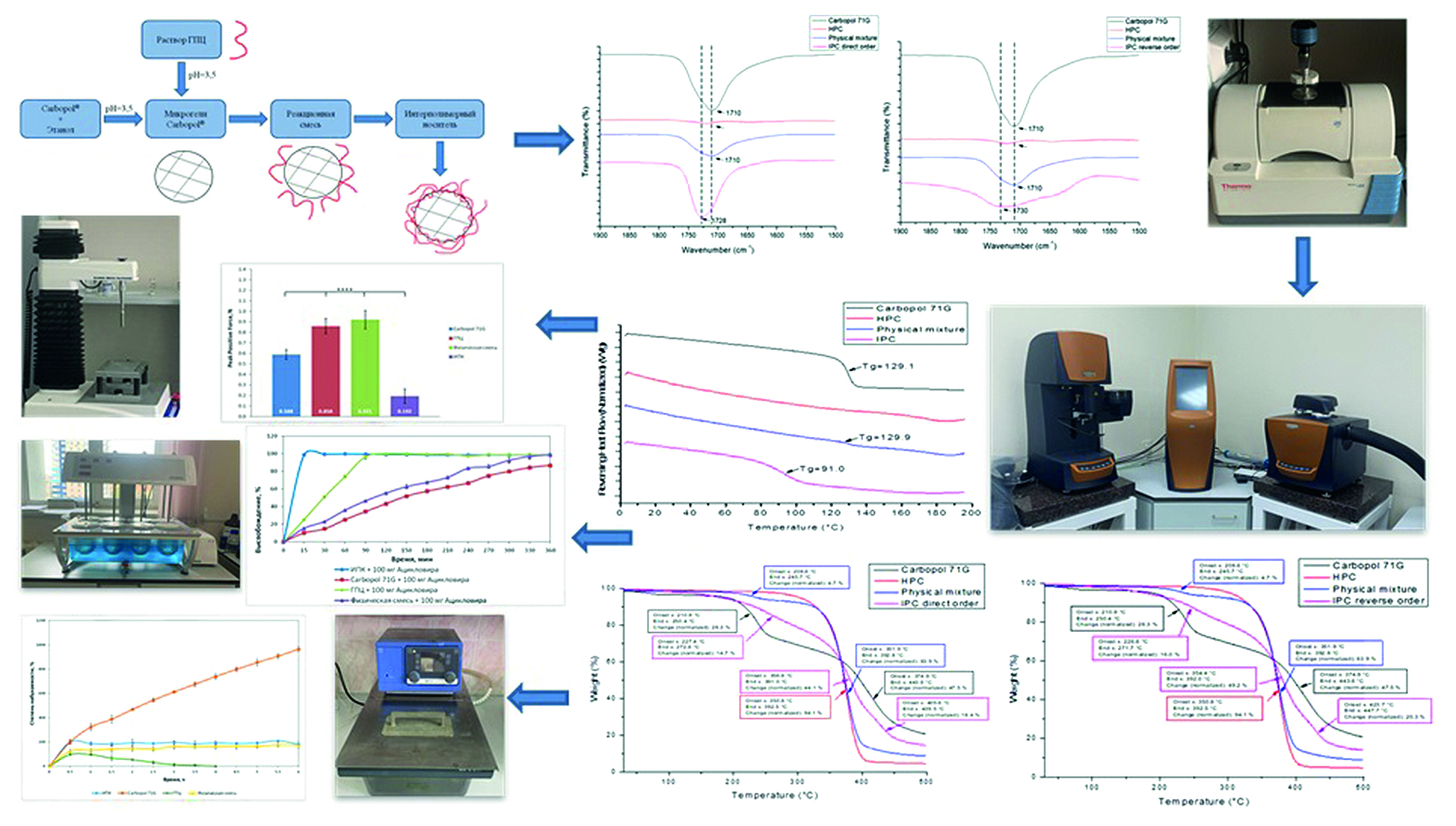 Результаты и обсуждение. Формирование ИПК происходит посредством образования водородных связей между —OH-группами макромолекулярных звеньев линейной ГПЦ и —COOH-группами редкосшитой полиакриловой кислоты (рПАК) в составе используемых марок карбополов. Смещение характеристической полосы влево до 1730 см–1 на ИК-спектрах поликомплексов подтверждает образование ИПК. ИПК характеризуются единственной температурой стеклования (Тс = 91,0 ± 2,1 °C). Элементный анализ выявил двухкратный мольный избыток редкосшитого полимера (Carbopol® 71G) над линейным (ГПЦ). На протяжении всего эксперимента по изучению кинетики набухаемости компактированные матрицы сохраняют свою форму, увеличиваясь в размерах. С использованием термического анализа образцов поликомплексных матриц в процессе оценки их набухаемости был проведен мониторинг возможных структурных преобразований, подтвердивший устойчивость поликомплекса в кислой среде. По результатам исследования кинетики высвобождения модельного АФИ максимальная концентрация ацикловира, перешедшего в среду, наблюдается на 30-й мин эксперимента и составляет 98,5 %. Тогда как для ГПЦ-матриц максимальная концентрация достигается по истечении 2 ч, а для матриц на основе Carbopol® 71G и их физической смеси (ФС) – только в заключительной части эксперимента. Синтезированный ИПК характеризовался низкой способностью к мукоадгезии к компактам из муцина по сравнению с индивидуальными полимерами и ФС.