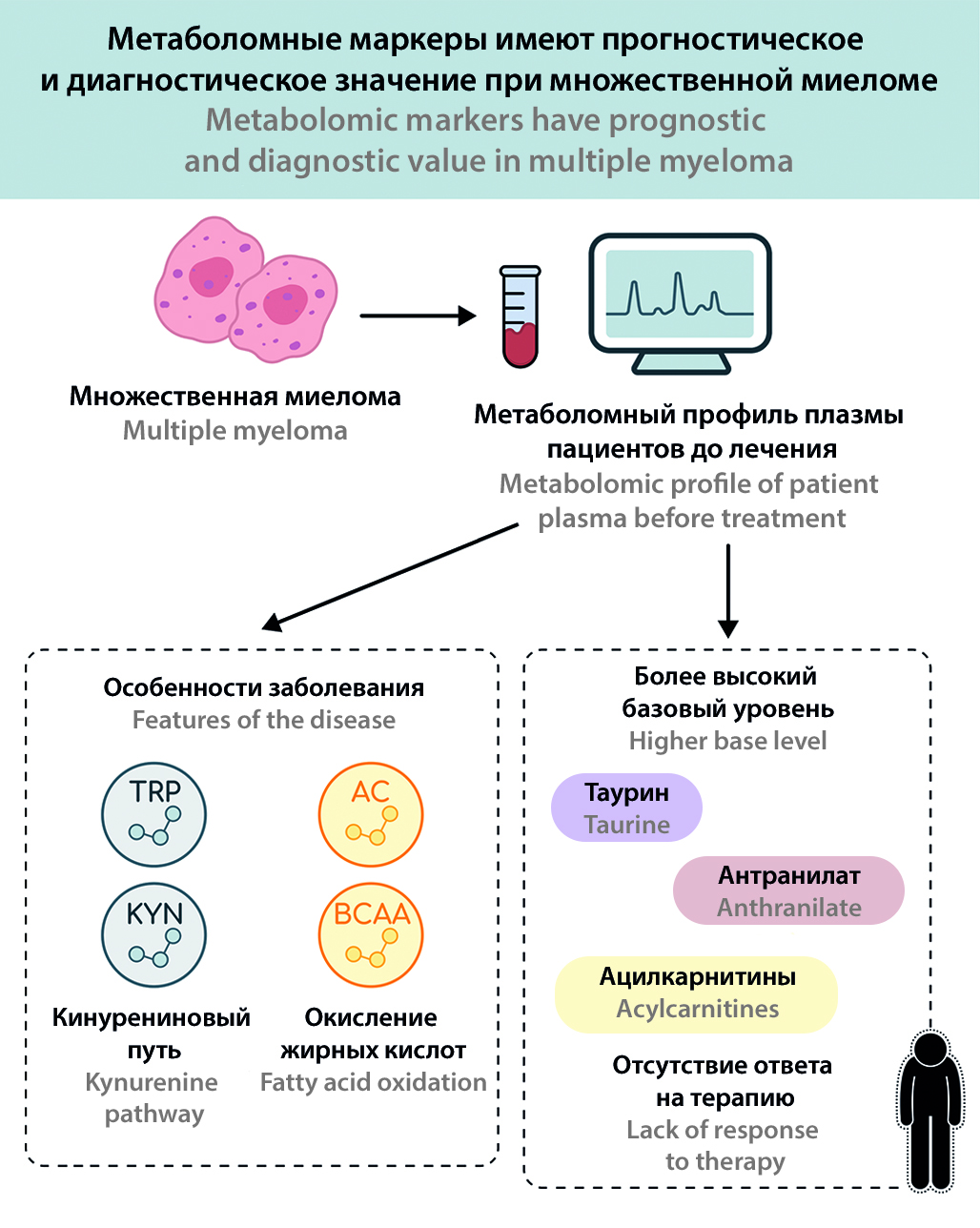 Введение. Множественная миелома (ММ) представляет собой злокачественное заболевание плазматических клеток, характеризующееся выраженной гетерогенностью клинического течения и вариабельностью ответа на лечение. Метаболомный анализ, отражающий совокупность малых молекул в биологических жидкостях, открывает новые возможности для поиска диагностических и прогностических биомаркеров.