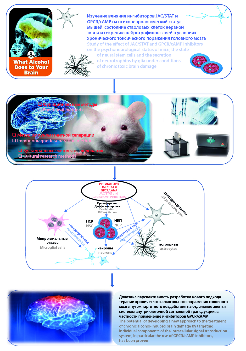 Результаты и обсуждение. Введение ингибиторов JAC/STAT и GPCR/cAMP корригировало функциональные признаки патологии мозга алкогольного генеза (наблюдалась отмена изменений ориентировочно-исследовательского поведения). При этом курсовое применение ингибитора GPCR/cAMP нивелировало, а введение блокатора JAC/STAT усугубляло снижение уровня воспроизведения условного рефлекса пассивного избегания у алкоголизированных мышей. В группах животных, получавших ингибиторы JAC/STAT и GPCR/cAMP, отмечалось возрастание числа нейральных стволовых клеток и коммитированных нейрональных предшественников, сопровождающееся повышением их митотической активности и интенсивности специализации. Введение ингибитора GPCR/cAMP после моделирования этанолиндуцированного поражения головного мозга сопровождалось повышением секреции нейротрофинов астроцитами и микроглией.