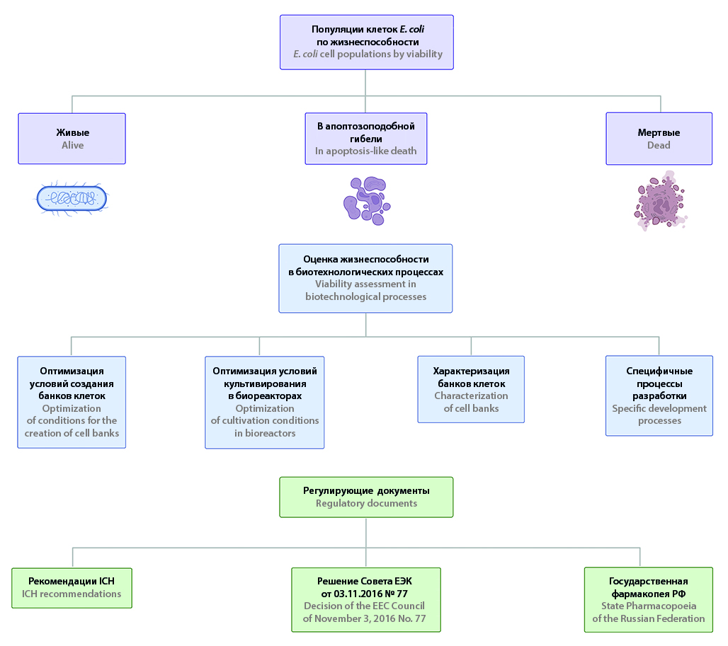 Введение. Около 30 % генно-инженерных терапевтических белков производится в Escherichia coli. При наработке рекомбинантных белков одним из факторов, определяющих эффективность процесса и качество продукта, является показатель жизнеспособности клеток. Важно контролировать жизнеспособность при формировании банков клеток и оценке их стабильности в процессе хранения, а также при разработке условий культивирования штаммов. Изменение условий хранения или культивирования может приводить к изменению структуры клеточной популяции с изменением соотношения жизнеспособных, мертвых и находящихся в апоптозоподобной гибели (ALD, apoptosis-like death) клеток. Одним из способов оценки популяций клеток может являться метод проточной цитометрии с окрашиванием.