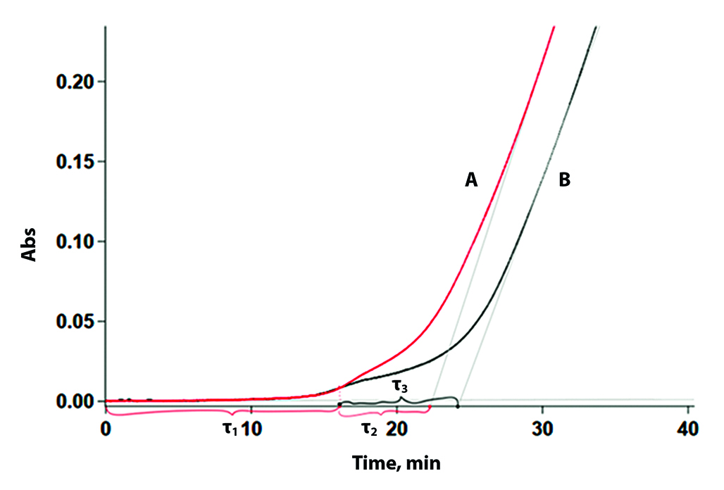 Результаты и обсуждение. Для исследуемых композиций выявлено образование двух периодов плато в их кинетических кривых, продолжительность которых оказалась пропорциональна содержанию компонентов композиции, что дает возможность проводить их количественное определение при соотнесении периодов плато с конкретными компонентами. Разработанная методика позволяет определять количество полифенолов с относительной ошибкой (δ) не более 3,7 % и относительным стандартным отклонением (RSD) не более 2 %.