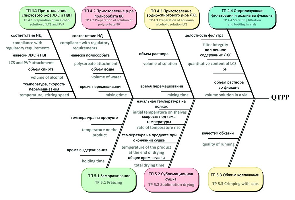 Результаты и обсуждение. При идентификации рисков производственного процесса выявлены основные критические параметры процесса и критические контрольные точки, среди которых наибольшее значение оказывают соблюдение режима растворения фармацевтической субстанции и вспомогательных веществ, фильтрации полученного раствора и его лиофилизации, а также контроль по основным показателям качества, характерным для лиофилизатов для парентерального применения.